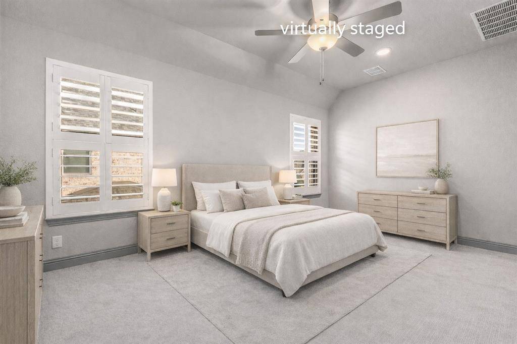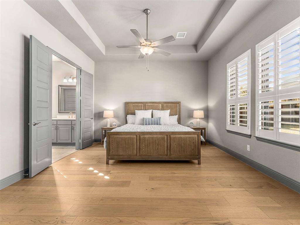 Beautifully crafted by Drees Homes, this stunning 1.5-story, 4-bedroom, 4-bath home sits on an oversized 0.257-acre lot in the highly desirable Legacy Gardens community of Prosper. Perfect for growing families, this home offers generous indoor and outdoor space, top-rated schools, and unbeatable convenience just minutes from the Dallas North Tollway for an easy commute. Zoned to acclaimed Prosper ISD, including the new on-site elementary school and future middle school. Inside, upgraded wide-plank wood floors flow through the main living areas, creating a warm and welcoming space for everyday living. The soaring ceilings and striking fireplace anchor the spacious living room. The chef's kitchen is designed for both busy mornings and weekend entertaining, featuring shaker-style cabinetry, designer subway tile, a KitchenAid 6-burner cooktop, double ovens, oversized granite island, stainless-steel apron-front sink, and a large walk-in pantry. The private study with French doors is perfect for working from home or managing family schedules. The serene primary suite offers quartz vanities, a soaking tub, oversized shower with bench, and a generous walk-in closet. Two additional main-floor bedrooms provide flexibility for kids or guests, while upstairs includes a spacious game room, media room wired for surround sound, and a private guest suite with full bath. Step outside to an extended covered patio overlooking a spacious backyard with plenty of room for a future pool, playset, or outdoor entertaining area. This is a rare and hard to find large lot size for Prosper. Additional features include 3-car garage with epoxy flooring and EV charger, custom shutters throughout and whole-home water softener. Legacy Gardens residents enjoy resort-style amenities including an infinity-edge pool, fitness studio, yoga lawn, playground, co-working lounge, and conference rooms creating a true community environment for families to connect and thrive. This home is spotless and turnkey.