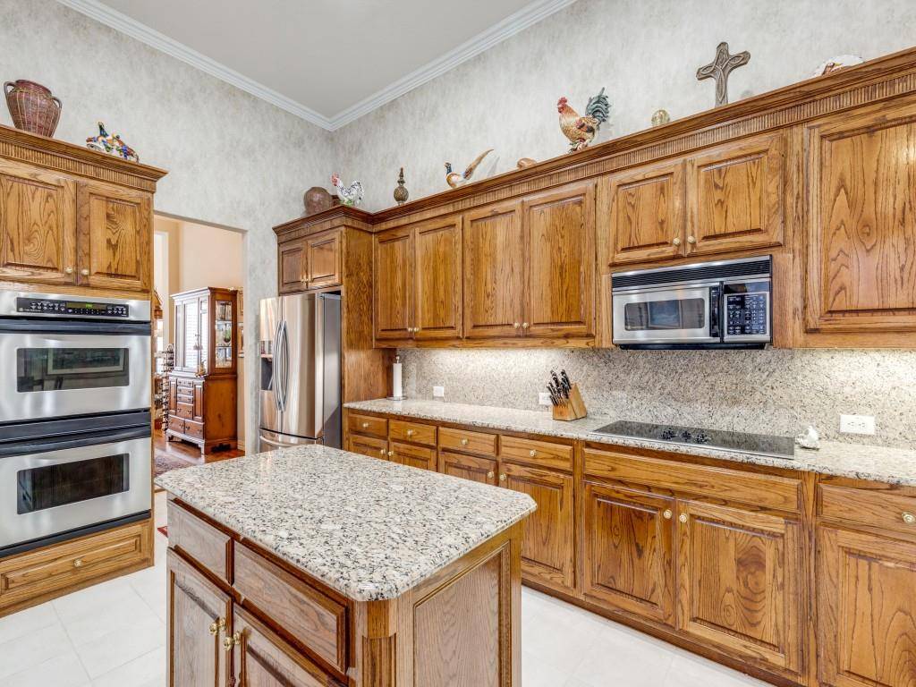 Beautiful, original owner, home in the desirable guard-gated Oak Tree enclave in Far North Dallas and one of only 5 homes in the community backing to the greenbelt. The majority of this 4 bedroom, 3 bath, 2 half bath home is on one level offering the convenience of the primary down. Generous entryway opens to combined formal living and dining with soaring 12' ceilings, crown molding and plantation shutters. Large family room affords easy entertaining with wet bar and fireplace, and is surrounded with windows letting in ample natural light with views to the pool and lush landscape beyond. Large eat-in kitchen includes stainless steel appliances with double oven and built in microwave. Utility room off the kitchen includes sink and storage and leads to a three car garage. All 4 bedrooms are down; one secondary with ensuite bath and two secondaries joined by Jack and Jill bath. Split floor plan allows privacy for spacious primary including a fireplace and large ensuite bath and walk-in closet. One bonus room upstairs provides space for more living or game room with additional half bath. Backyard oasis includes a pool, spa and outdoor kitchen with built-in grill and expansive views of the greenbelt.