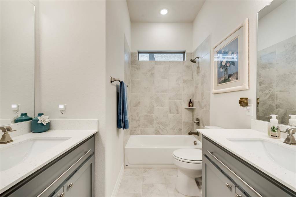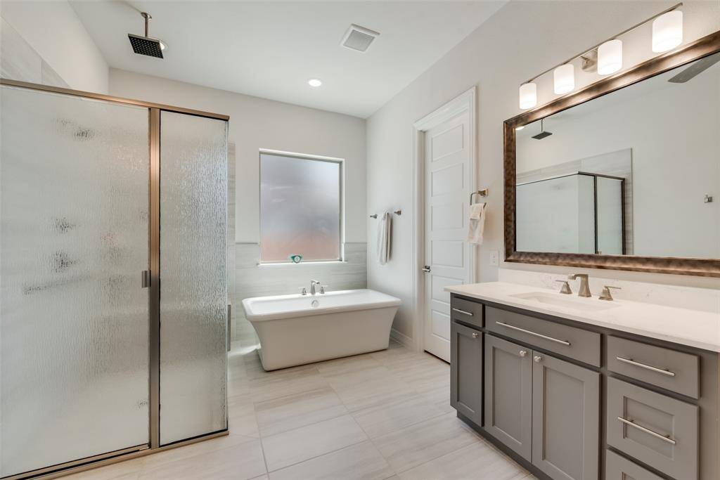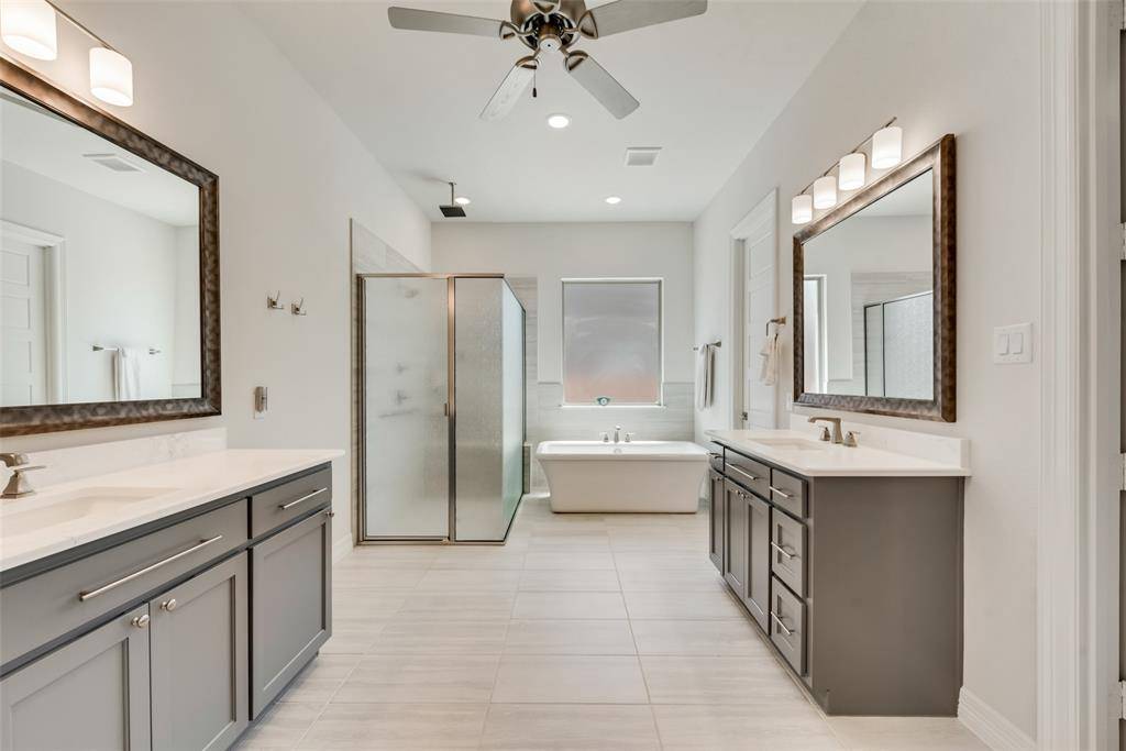 The private primary suite offers a spa-style bath with soaking tub, oversized walk-in shower, and large closet.