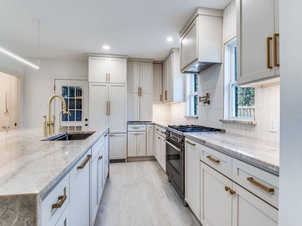 The home features a newly constructed covered garage and a beautifully updated interior anchored by a chef's kitchen with Taj Mahal countertops, custom cabinetry, a built-in Fisher & Paykel refrigerator, built-in Bosch dishwasher, and a statement Bertazzoni range. The kitchen flows seamlessly into the main living space, perfect for both everyday living and entertaining.
