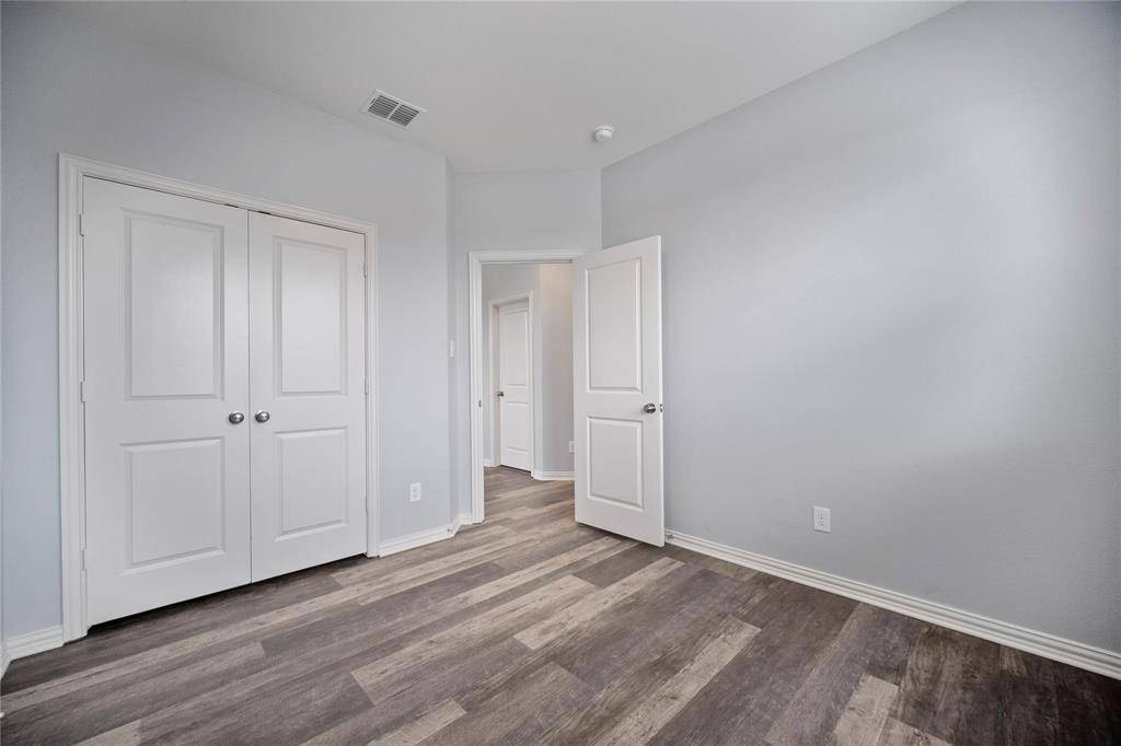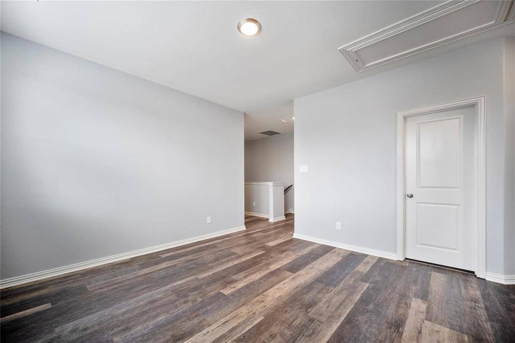 Upstairs, the primary bedroom offers a spacious walk-in closet and a private bathroom with dual sinks, a makeup vanity, and a large walk-in shower with a built-in seat. The second-floor game room has a fun accent wall that adds personality to the space. All bedrooms include wood-look floors, ceiling fans to help keep energy costs down, and window coverings already in place.