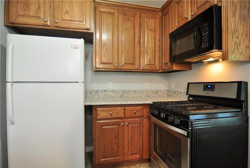 The kitchen features granite countertops, replaced cabinetry, ceramic tile flooring, and a full appliance package including a gas range, built-in microwave, and dishwasher. The renovated bathroom continues the updated aesthetic with modern finishes.
