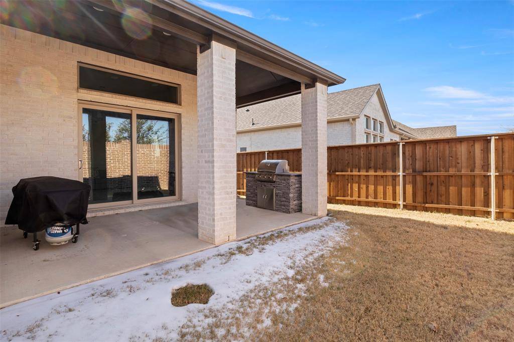 Welcome to Stunning Trophy Signature Home in Premier 55+ Community, where comfort, convenience, and elevated living come together! HOA includes front yard maintenance for easy, low-maintenance living. This beautifully maintained, open-concept Trophy Signature one-story home offers 3 spacious bedrooms, 2.5 baths, and a versatile executive office—perfect for working from home or flex space. Step inside to an inviting floor plan featuring soaring vaulted ceilings, gorgeous flooring and designer lighting, abundant natural light, and neutral paint tones throughout to complement any décor and style. The heart of the home is a generous living area with a cozy gas fireplace, seamlessly connecting to the gourmet kitchen and breakfast nook—both offering charming outdoor views. This chef-inspired kitchen showcases elegant quartz countertops and a full suite of stainless steel appliances, including double ovens, a gas cooktop, Under Kitchen counter Wine Cooler and a built-in microwave. The primary suite is a private retreat featuring a walk-in closet and a luxurious ensuite bath with a large walk-in shower and dual sinks. A junior suite with its own private bath, plus a convenient powder room, provides ample space for guests and family. Additional features include window blinds, open attic AC vent, gutters with covers, and more. Outdoor living is a delight with a private covered patio, perfect for morning coffee or evening entertaining. The built-in gas grill makes hosting friends and family a breeze. Residents of this vibrant community enjoy resort-style amenities, including a clubhouse, pool, park, and pickleball courts—fostering an active and social lifestyle. Located in the heart of Allen, this exceptional home offers easy access to 121 and 75, with shopping, dining, and entertainment just minutes away. Installed Tesla charger stays with the property in the garage.