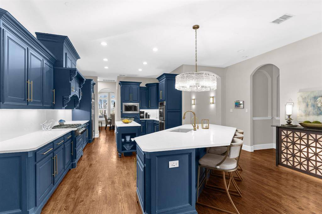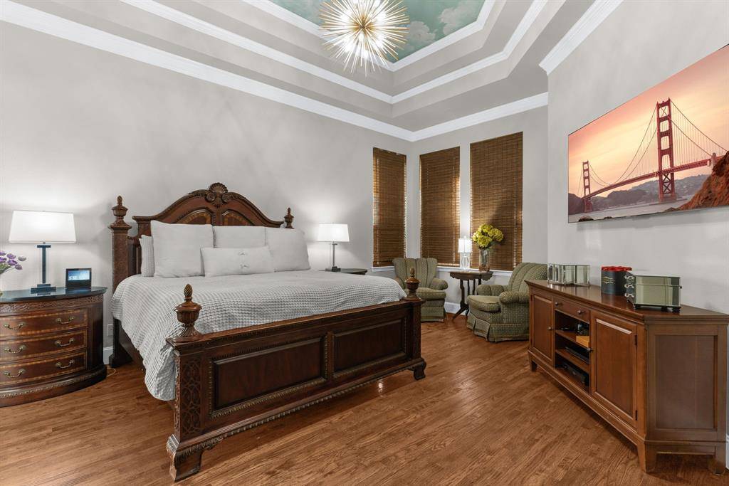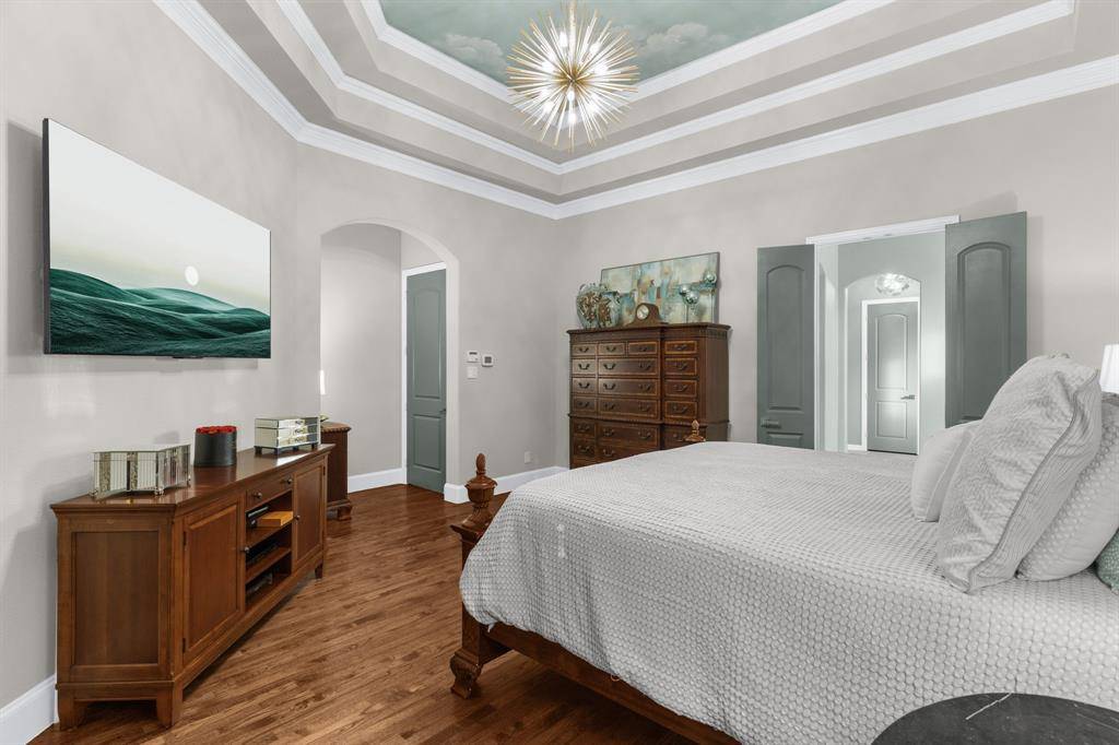 Premier Allen Location on a Private, Corner Lot! Updates You'll Love in nearly 5300 sq.ft. of Comfort & Luxury! Heated Swimming Pool-Spa newly renovated pebble tech surface + a Putting Green! Outdoor Living Space has a Built-in Grill, Fireplace & Pergola & a Covered Patio for Year-Round Entertaining! Zoned to award-winning Allen ISD! Yes...The perfect package! Gated porte cochere elevation boasts a 5-bdrm floorplan featuring: the primary suite + guest bdrm-bath down, 3 more large bdrms upstairs; a handsome executive study; 2-story family room has a WBFP; a 2nd office-homework center; dual staircases lead to a huge gameroom with 3 flat screen TVs & a wetbar; dedicated media room includes a projector, screen, operating components, a wet bar & refrig. Many more updates in this awesome home: Current paint tones compliment the handscraped hardwood floors; Remodeled kitchen with fantastic storage for the chef in the family showcases quartz counters + full quartz backsplash with no-show electrical outlets, beautiful deep blue cabinet paint & gold hardware, crystal pendant chandelier + stainless appliances including a SubZero refrigerator! Adjacent to the study is an alcove bar with a quartz countertop, custom lighting & wine rack shelving. High-end chandeliers, ceiling fans, vanity lighting throughout. Impressive wrought iron front door. Great natural light abounds in the 2-story living room notable for picture windows & the double-stacked fireplace mantle--all yours while enjoying views of the outdoor living space. The spacious primary suite showcases a hand-painted ceiling mural, dual vanities, a jetted tub & a large closet. For those who love a sleek, organized garage for classic automobiles...check out the seller's custom-designed 2-car garage: dramatic paint, attached cabinets, epoxy floor. Separate 1-car garage also has organizers & epoxy floor too. Shaddock Park is so convenient to shopping, entertainment & 2 expressways for easy commuting! Make Your Move Today!!