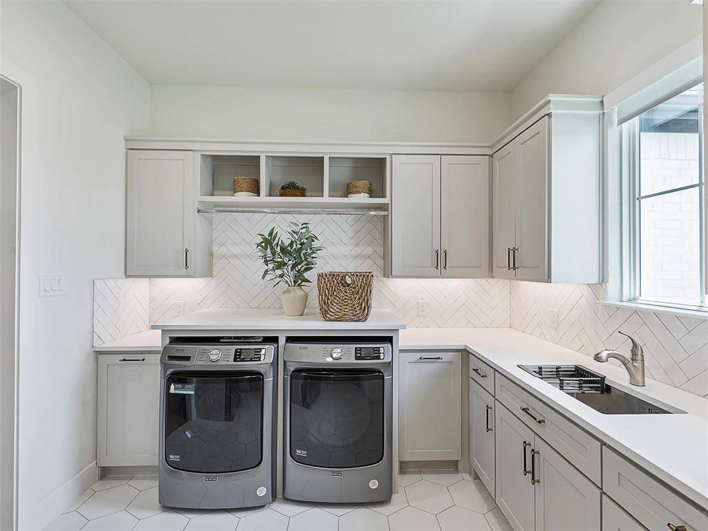 Outdoor amenities include a second fireplace, outdoor kitchen, and ample seating within the covered patio area. Adjacent to this space is a sizable game room, equipped with two built-in wine coolers, a wet bar, and substantial storage options. Functional utility spaces include a laundry room with abundant cabinetry, counter space, drip-dry area, freezer accommodations, and full-sized washer-dryer hookups. The three-car swing garage is finished with epoxy flooring and offers a fully floored attic for exceptional storage capacity.