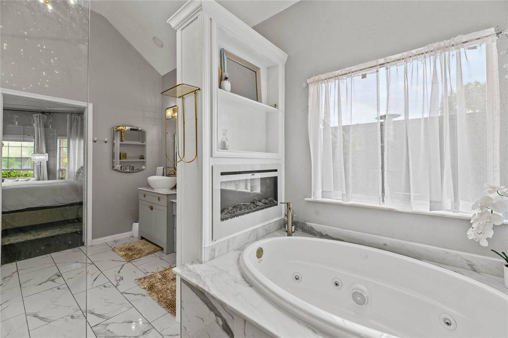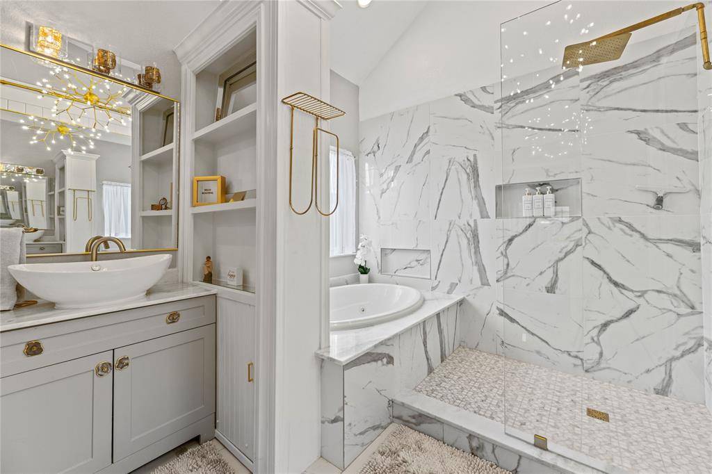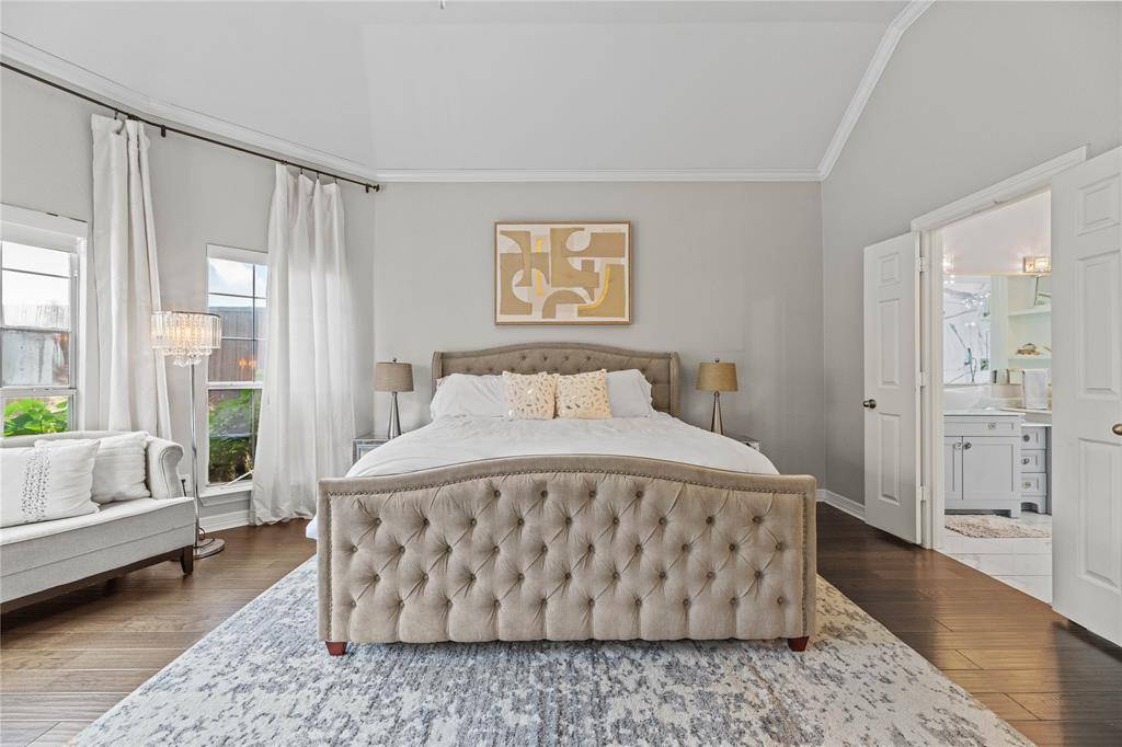Home opens to Hardwood Flooring , Stacked Formals Featuring Crown Molding and Plantation Shutters. Gourmet Kitchen with Hardwood Floors, Walk In Pantry, Breakfast Bar, Built in Oven-Microwave, Wood Blinds. Open to Elegant Family Room with Fireplace. Secluded Master Retreat on First Floor, Overlooking Private Back Yard Oasis. Crown Molding, Designer Lighting, Primary Bathroom with Deluxe Finish Out and Walk in Custom Closet. Double Sinks, Jacuzzi Tub, Separate Steam Shower. Bedroom Two can Be Used As Study, First Floor with Private Full Bathroom, Wood Shutters, Designer Lighting.