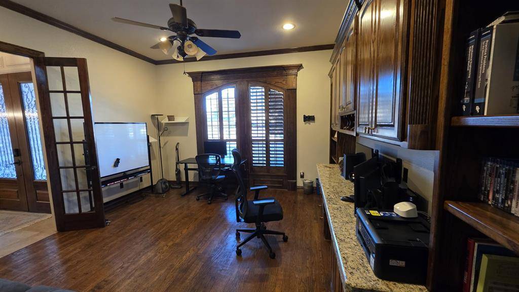 Beautiful , rare custom home in Reatta Place in Colleyville with fantastic curb appeal and a wonderful floorplan that features 4 bedrooms and 4 baths. 3 of them on first floor . Executive study features built-ins and is perfect for working from home. Chefs kitchen was updated in 2020 with double ovens, new cooktop, microwave, dishwasher, and water softener. Enjoy movie night in your home theater with large screen, surround sound projector and reclining seats. Massive Game Room with wet bar. Inviting outdoor space includes saltwater pool, spa, water slide and water feature. Entertain outdoors in the gazebo, bar and cooking area as well as plenty of room for a dining table.2 storage sheds that are hidden behind hedges offer ample room for extra storage. RV hookup with 50 amp. Recent improvements: Roof & gutters July 2024, generator backup panel, water heaters 2016, 2 new AC units 2019, 3rd unit 8-24, new paint 2021, new carpet 2020 & 2021, backsplash 2021, pool pump and heater 2021,2024, new hardware 2021, some lighting replaced 2021, outdoor area-new tile 2021