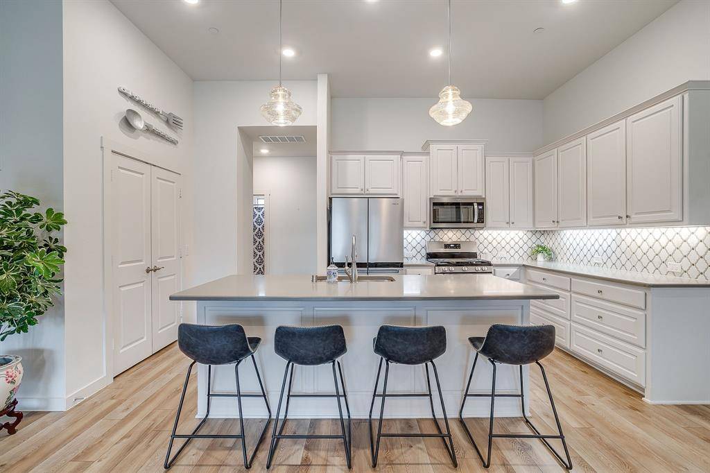 Inside, the light-filled floor plan features soaring ceilings, wide-plank flooring, and a seamless flow between the living, dining, and kitchen spaces. The kitchen showcases crisp cabinetry, stainless steel appliances, generous counter space, and a large island overlooking the main living area.