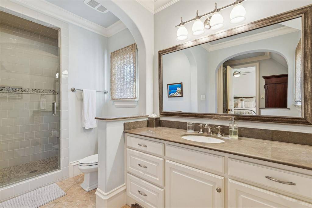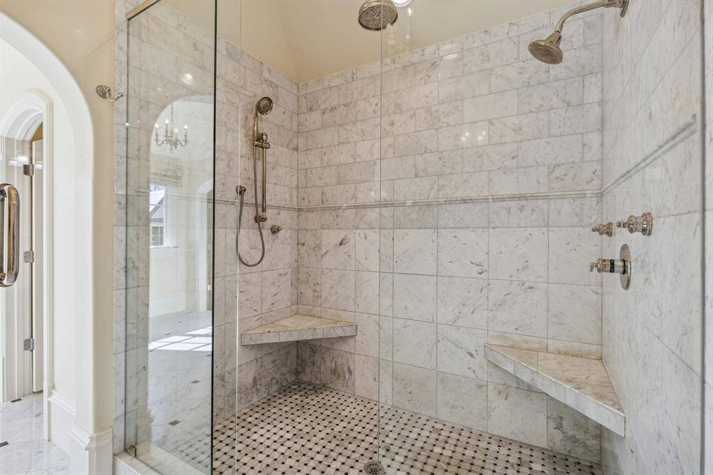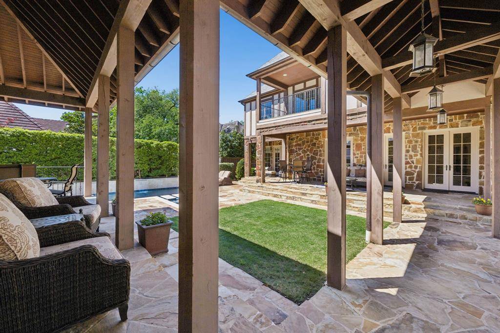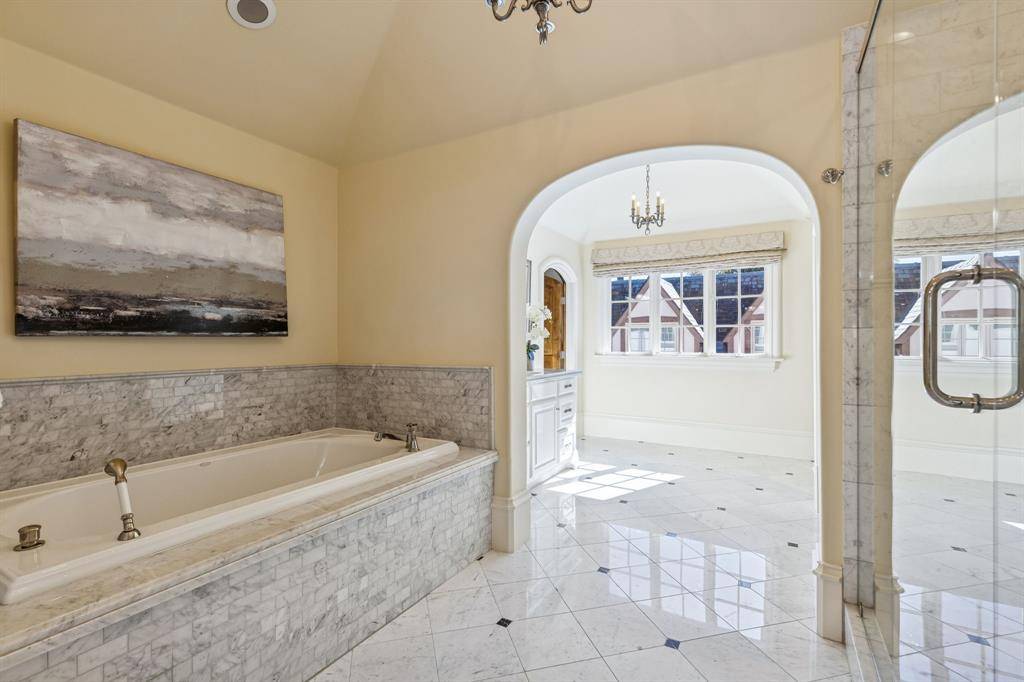 Situated on an impressive 90-foot lot in the heart of the French Streets, this gorgeous Tudor-style residence built by Tatum Brown offers an exceptional blend of architectural distinction and timeless craftsmanship. Surrounded by mature live oak trees, the home features a stunning entry and staircase complemented by exquisite moldings, detailed millwork, and hand-scraped hardwoods. The main level includes a formal living room with a striking stone fireplace and a dining room with a 300-plus bottle wine closet. Designed for entertaining, the open kitchen comes with stainless Viking appliances, granite countertops, island, built-in refrigerator, and a walk-in pantry. A breakfast room and wet bar flank the kitchen. French doors lead to a loggia overlooking a pool and spa surrounded with Oklahoma flagstone. Completing the first floor are a guest bedroom, full bath, and an impressive office with beautiful coffered ceilings and views of the front yard. The second level houses a very spacious and luxurious primary suite with a sitting area—suitable for a study or nursery—and a covered balcony overlooking the pool. The primary bath includes separate vanities with marble countertops, an oversized marble shower, and his and her walk-in closets. All secondary upstairs bedrooms feature ensuite bathrooms and walk-in closets, while a third-floor media room offers flexibility as a sixth bedroom. Additional highlights consist of a three-car garage with quarters above and a cabana with full bath, providing an additional 958 square feet. High-end details and amenities such as a slate roof, copper gutters, porte-cochere, electric gate, laundry room, mud room, elevator, and covered outdoor kitchen round out this remarkable property.