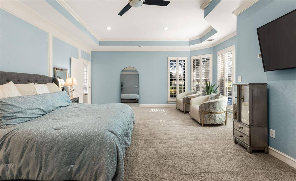Set on nearly one acre along the prestigious Gleneagles Kings Course No. 3 Tee Box, this exceptional golf course estate offers refined luxury and resort-style living in a breathtaking setting. A grand entry with double iron and glass doors opens to elegant interiors defined by travertine flooring, soaring ceilings, and impeccable craftsmanship. The living room features a stately fireplace, built-in cabinetry with a wine refrigerator, and a wall of windows showcasing panoramic fairway views. The chic dining room sparkles beneath a designer chandelier and is complemented by a fully appointed butler's pantry. Designed for entertaining, the spacious den includes a walk-in wet bar with a wine closet, wine refrigerator, and ice maker, a fireplace, built-ins, and doors that open seamlessly to the patio. The expansive chef's kitchen centers around a large island and tall counters topped with striking Calcutta marble. Luxury appliances include Sub-Zero stainless steel refrigeration and a Wolf gas cooktop with pot filler and grill. A sunny breakfast nook with a stylish chandelier overlooks the outdoor oasis, and a back staircase adds convenience. The private primary retreat offers a sitting area and a sanctuary-like bath with a freestanding soaking tub, oversized rain shower, and dual walk-in closets. Additional spaces include a sophisticated study with built-ins and a fireplace, a game room with wood flooring and a window seat, and a private downstairs apartment with a separate entrance and full kitchen, ideal for guests or multigenerational living. Outdoor living rivals a luxury resort with an enclosed covered patio with remote shades, a stunning pool and spa, expansive green space, and sweeping views of the Kings Course fairways. This is elevated living in one of the area's most coveted golf course communities.