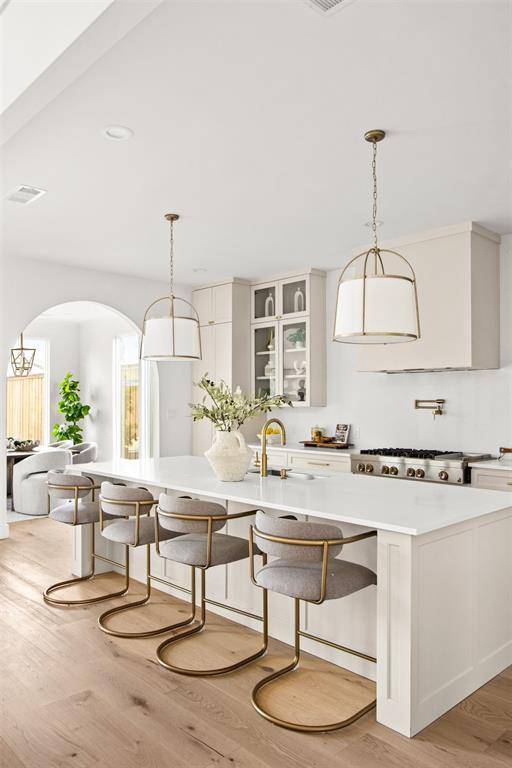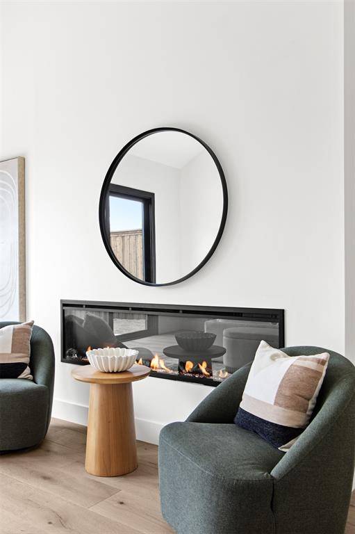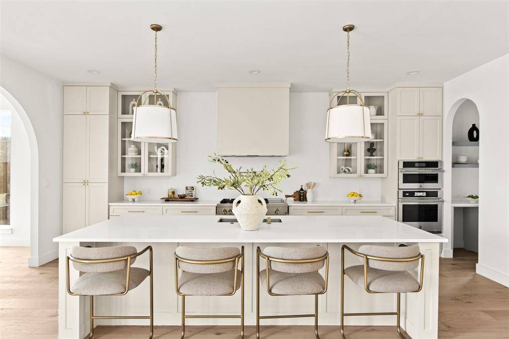 The open-concept layout seamlessly connects the main living areas, anchored by a sophisticated chef's kitchen featuring custom cabinetry, premium appliances, and an oversized island. The kitchen flows effortlessly into the living and dining spaces, where large glass doors enhance the indoor-outdoor connection—ideal for both intimate gatherings and larger-scale entertaining.