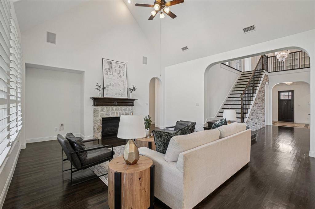 Income-producing property leased at $5,500-month through January 15, 2027. Lease transfers to buyer at closing. Nestled within the prestigious guard-gated Hogan's Glen Golf Course community this residence is situated on a desirable cul-de-sac lot & offers impressive curb appeal featuring a three-car garage. Upon entrance exquisite craftsmanship & attention to detail are evident throughout, including crown molding, decorative lighting, hand-scraped hardwood floors, plantation shutters, & fresh interior paint. The living room is highlighted by soaring cathedral ceilings, abundant natural light, & a striking Austin stone fireplace. The chef-inspired kitchen is thoughtfully designed with a large center island, gas cooktop, double ovens, stainless steel appliances, & extensive freshly painted cabinetry ideal for everyday living & entertaining. The primary suite serves as a true retreat, featuring crown molding, freshly painted custom cabinetry, dual vanities, a soaking garden tub, an oversized walk-in shower, & a spacious walk-in closet. A secondary primary or first-floor guest suite with ensuite bath & walk-in closet provides ideal accommodations for multi-generational living or guest suite. A dedicated executive office offers a quiet and comfortable work-from-home space. Upstairs, enjoy a spacious game & media room equipped with projector & full surround sound. Two additional bedrooms each featuring its own ensuite bath & walk-in closet. Built-in surround sound extends to the main living areas, creating an immersive entertainment experience. Step outside to a spacious backyard with extensive landscaping & ample room for a future pool or outdoor living. Additional upgrades include a reverse osmosis water filtration system, enhanced outdoor lighting, & smart lighting in the kitchen, entryway, & garage entry. Located in Trophy Club, residents enjoy stunning community amenities including lakes, walking trails, and a premier golf course. NOTE: TENANT OCCUPIED TILL JAN 2027