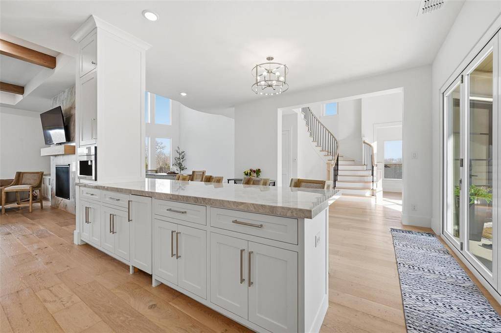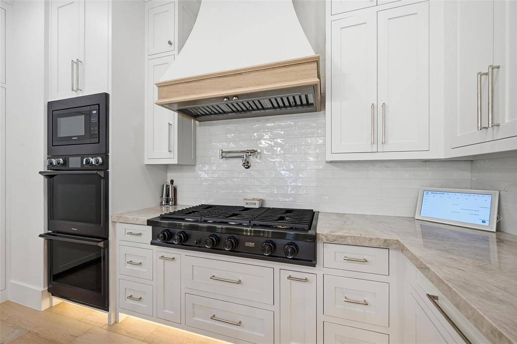 The showpiece kitchen is designed to impress with dual islands seating up to fourteen, Taj Mahal stone countertops, polished nickel hardware, a Dacor cooktop, Miele coffee system, nugget ice machine, panel-front refrigeration, and an expansive walk-in pantry. Designed for refined living, the primary retreat features a private sauna and spa-like finishes, while the second primary suite includes a dedicated coffee bar and beverage refrigerator. Both suites are outfitted with bidet toilets. The Walk in Pantry also includes a Full Size Wine Fridge.