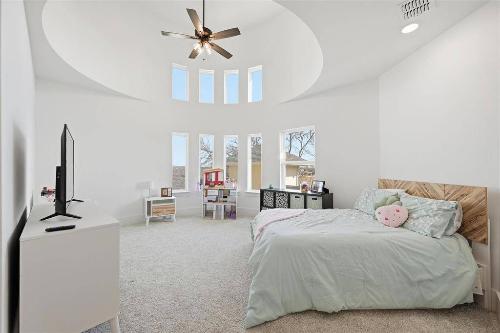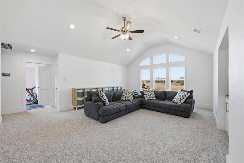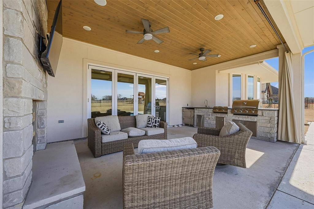 Accordion doors open to a private courtyard, blending indoor and outdoor living, while a full pool-access bath enhances entertaining. Upstairs offers three ensuite bedrooms, an oversized game room, and a generous fitness room adaptable as a future bedroom. Completing the property are a four-car garage with additional storage, an outdoor kitchen with grill and hibachi, underground septic sprinklers, and the privacy of acreage living paired with access to top-rated McKinney ISD schools.