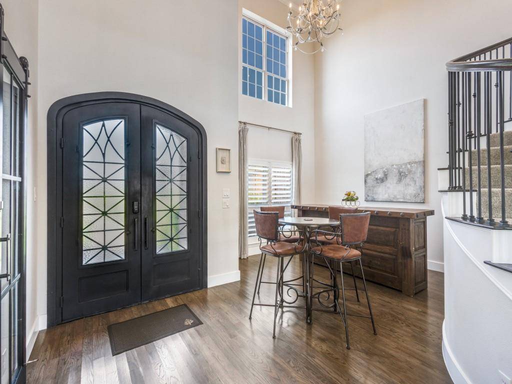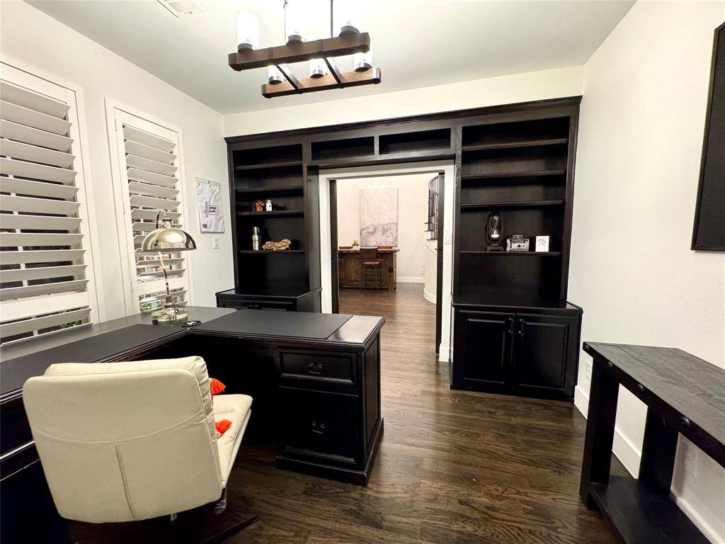 Interior features include built ins, custom steel exterior doors, plantation shutters, surround sound, and a utility room with quartz counters, sink, built-ins, and space for a desk or pet area.