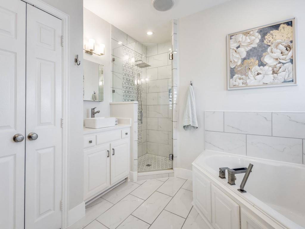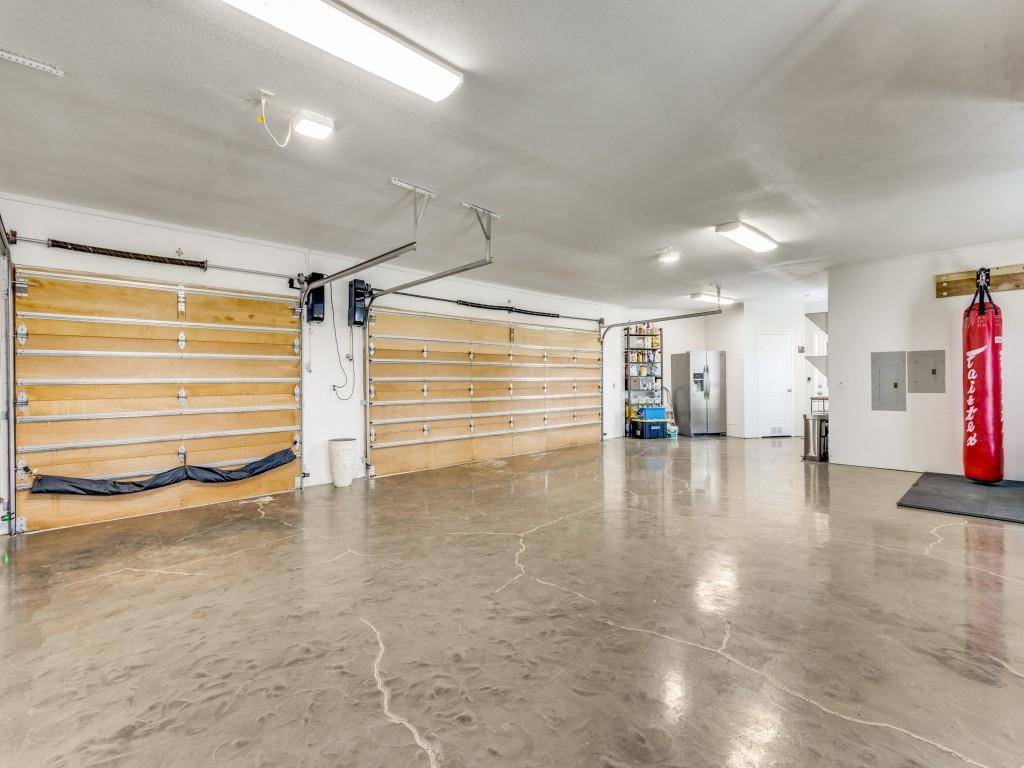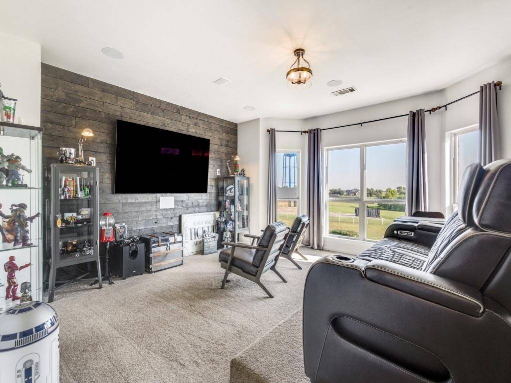 The primary suite is located on the main level with direct backyard access and an en-suite bath featuring Bluetooth speakers, mood lighting, and TV hookup. A secondary bedroom on the main level provides flexible use as a guest room, office, or gym. Additional spaces include a game room and a media room with platform seating, bay window, and media storage.