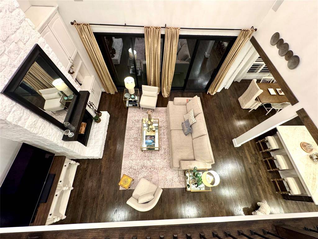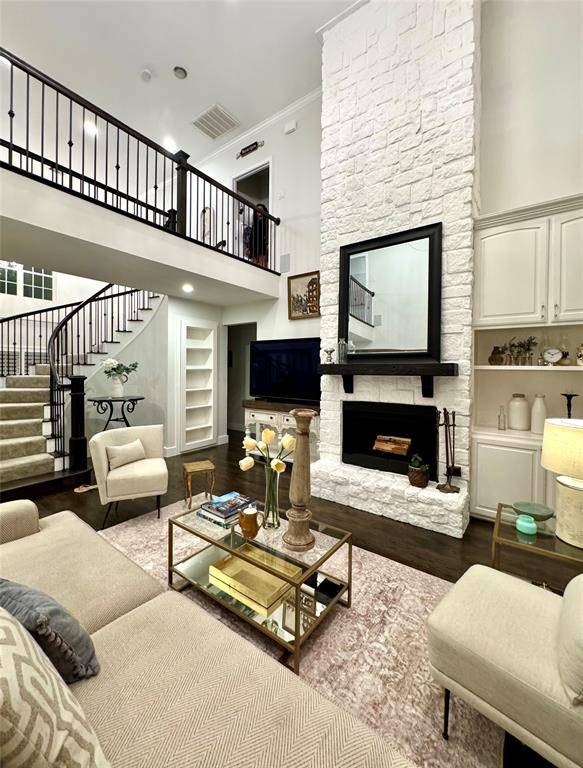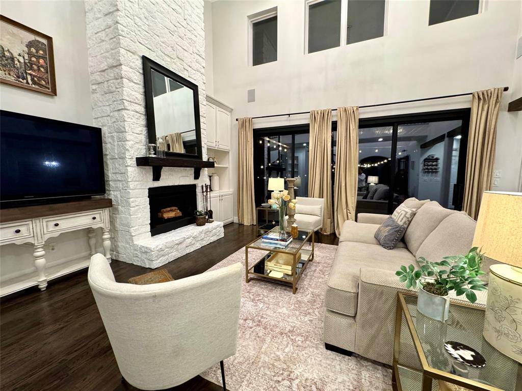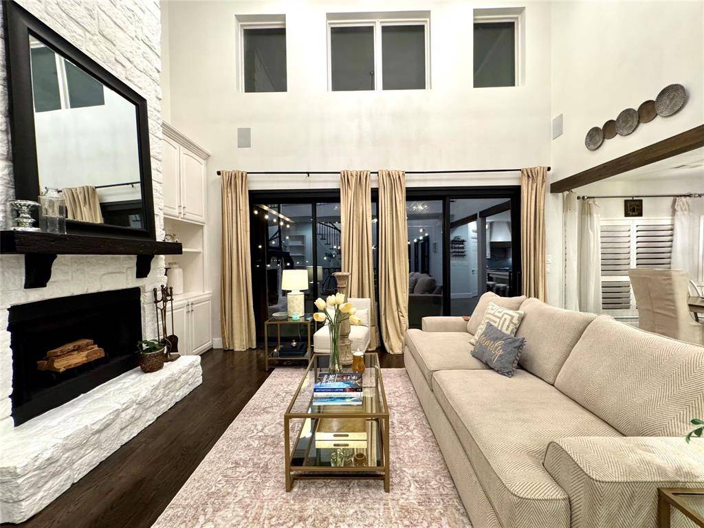 The home offers over 3,000 sq. ft. of living space with a grand entry featuring high ceilings, chandeliers, a curved staircase, and abundant natural light. The kitchen includes quartzite countertops, pot filler, and views of the backyard. The family room features a wood burning fireplace with cedar mantle and retractable glass doors opening to the pool area.