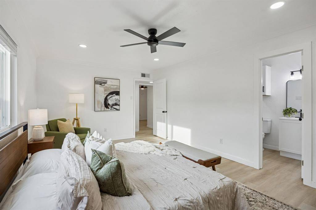 The primary suite offers a beautifully renovated ensuite bath with new vanity, mirrors, lighting and tile tub surround. The secondary bathroom has also been completely updated with modern finishes. All bedrooms include new ceiling fans and generous closet space.
