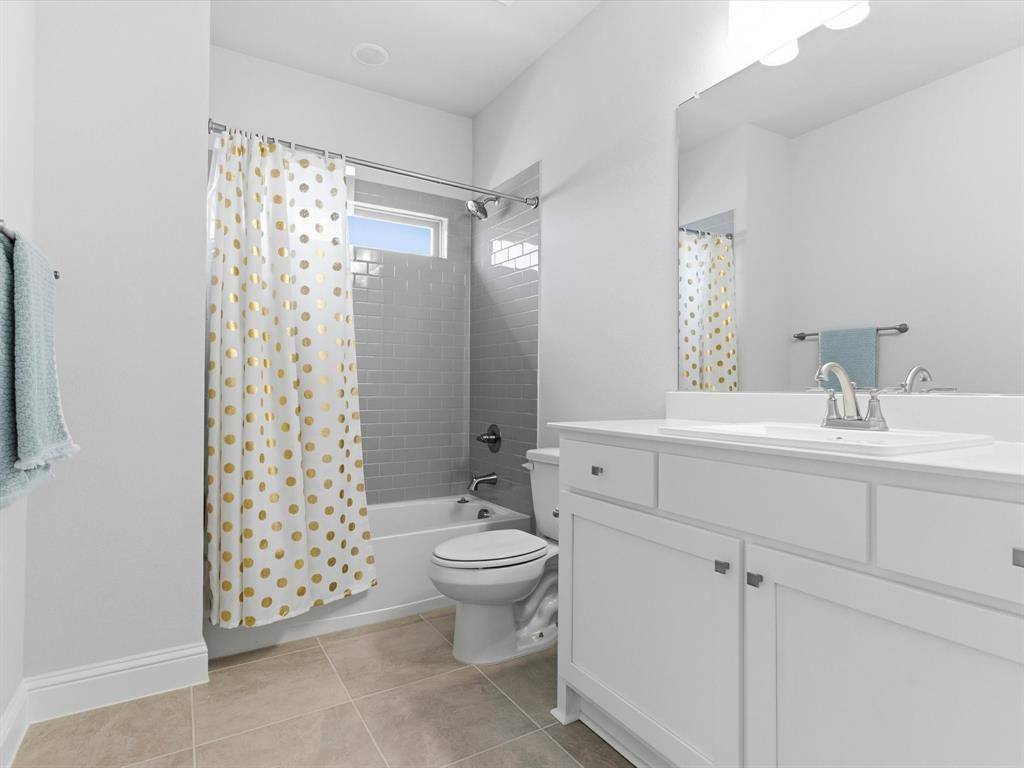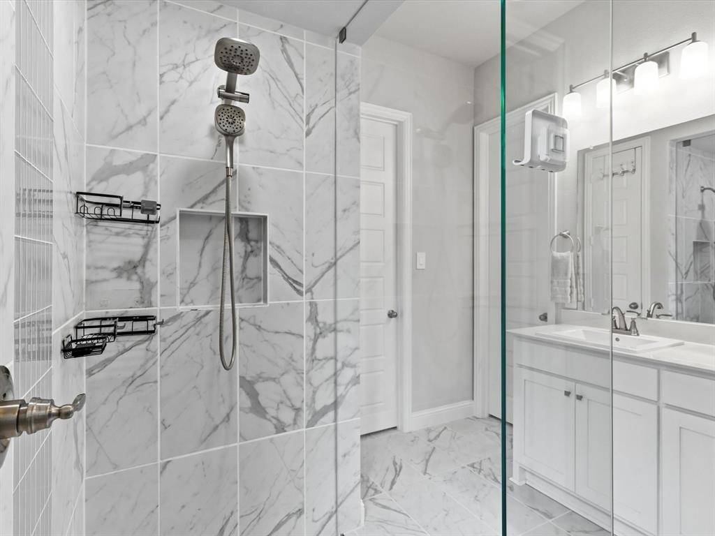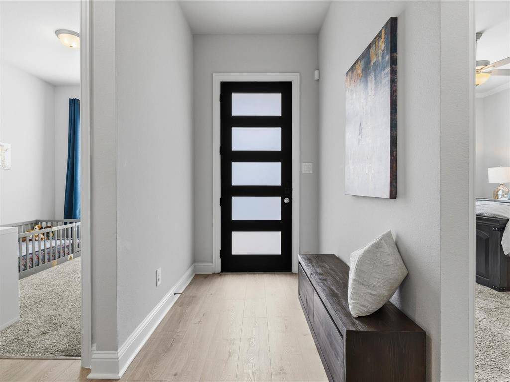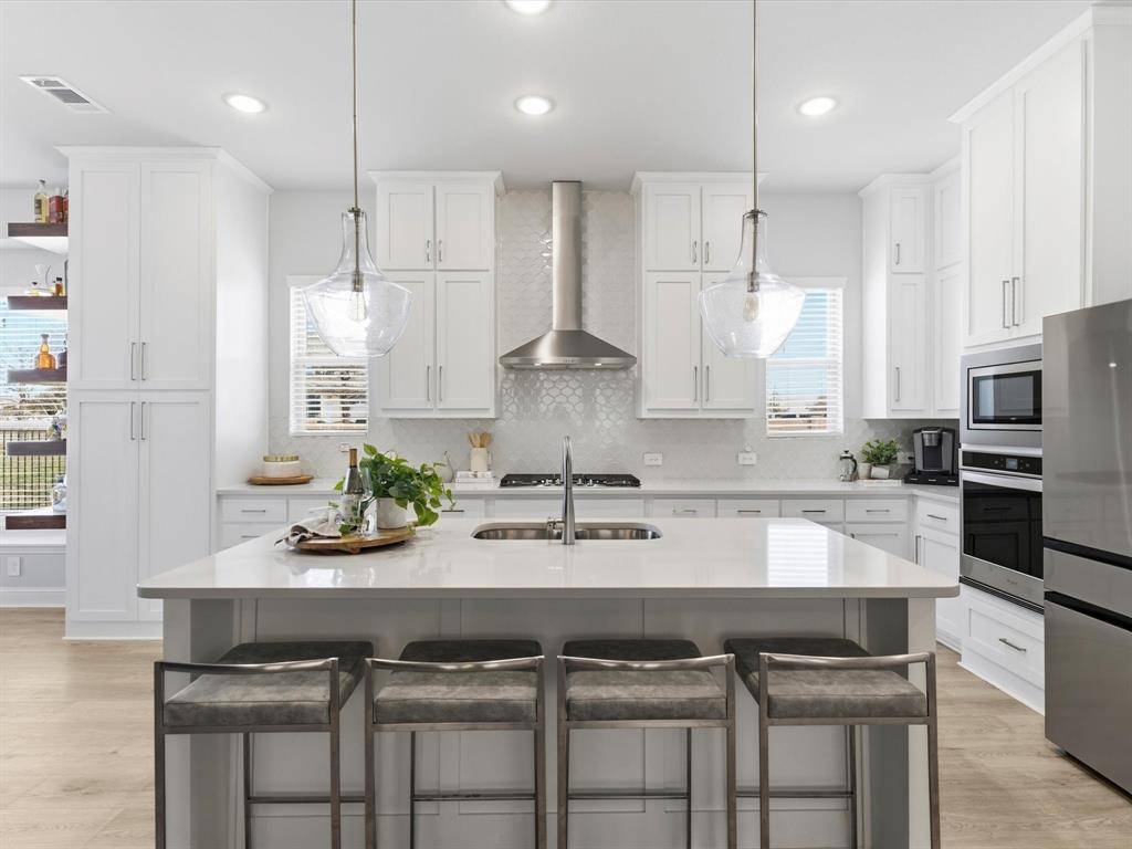 Breathtaking designer dream home on a corner lot loaded with upgrades and truly checking every box! The thoughtfully designed main floor features your primary suite along with a private office or mother-in-law suite complete with an adjacent full bath! Unwind in your spacious primary bedroom with a stunning spa-inspired ensuite bath with dual vanities, an oversized doorless walk-in shower adorned with gorgeous floor to ceiling Calacatta Empire designer tile. At the heart of the home, you'll find a show-stopping chef-style kitchen featuring sleek stainless steel Whirlpool appliances, a 5-burner gas cooktop, dual-bowl stainless steel sinks, upscale quartz countertops, elegant geometric tile backsplash, a sleek stainless steel vent hood, spacious center island with stylish pendant lighting, and striking floor-to-ceiling cabinetry! Upstairs, discover two additional bedrooms, an expansive game room, and a theatre-style media room, ideal for the kids hangouts and family movie nights. Additional upgrades include: Living room accent wall, custom wood shelving, added recessed lighting, 8' Mahogany door with frosted glass, raised stone pavers landscaping beds, Overhead garage storage racks and so much more! Get with agent for a full list of upgrades. Located in the highly sought after Mercer Crossing Master-Planned Community featuring an amenity center, gym, dog parks, playgrounds, lakes, and extensive walking trails. Location is unbeatable with easy access to 635, 35, President George Bush Turnpike, both airports, and countless shopping and dining options.