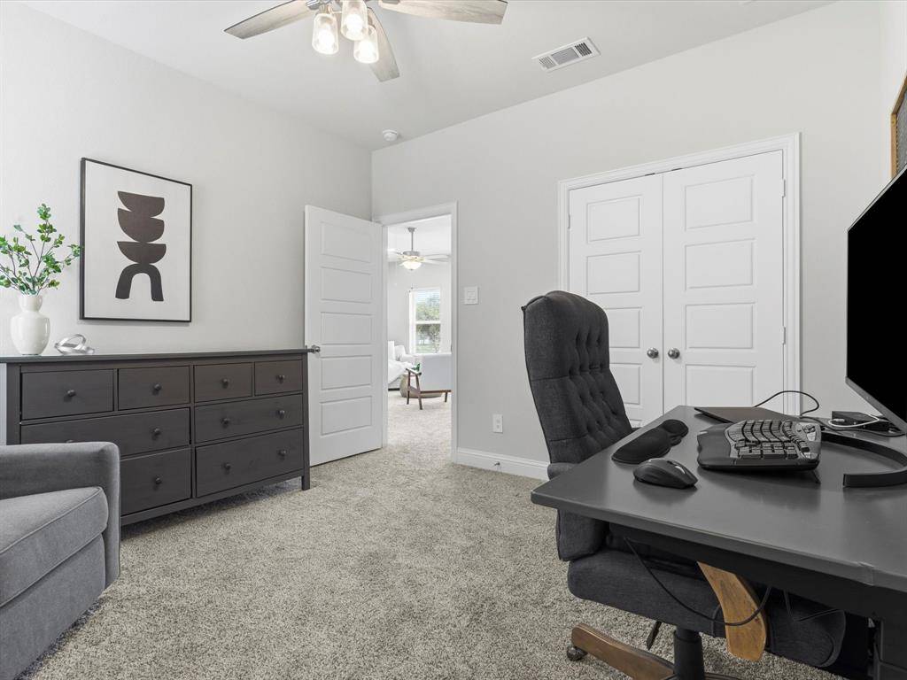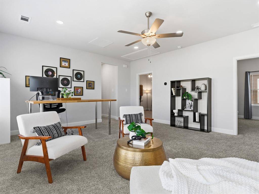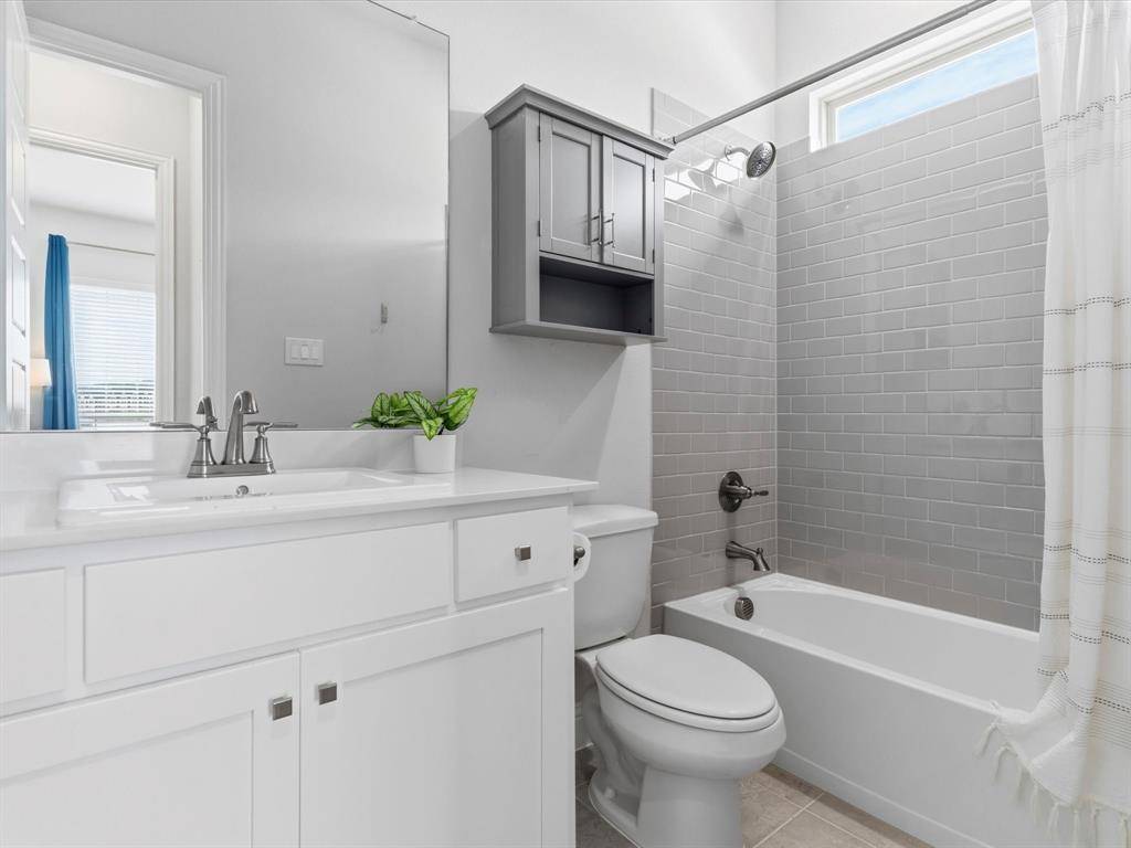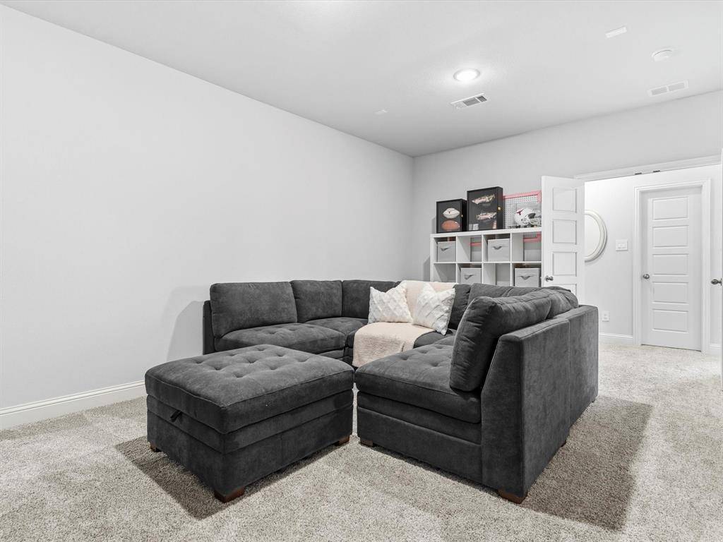 Breathtaking designer dream home on a corner lot loaded with upgrades and truly checking every box! The thoughtfully designed main floor features your primary suite along with a private office or mother-in-law suite complete with an adjacent full bath! Unwind in your spacious primary bedroom with a stunning spa-inspired ensuite bath with dual vanities, an oversized doorless walk-in shower adorned with gorgeous floor to ceiling Calacatta Empire designer tile. At the heart of the home, you'll find a show-stopping chef-style kitchen featuring sleek stainless steel Whirlpool appliances, a 5-burner gas cooktop, dual-bowl stainless steel sinks, upscale quartz countertops, elegant geometric tile backsplash, a sleek stainless steel vent hood, spacious center island with stylish pendant lighting, and striking floor-to-ceiling cabinetry! Upstairs, discover two additional bedrooms, an expansive game room, and a theatre-style media room, ideal for the kids hangouts and family movie nights. Additional upgrades include: Living room accent wall, custom wood shelving, added recessed lighting, 8' Mahogany door with frosted glass, raised stone pavers landscaping beds, Overhead garage storage racks and so much more! Get with agent for a full list of upgrades. Located in the highly sought after Mercer Crossing Master-Planned Community featuring an amenity center, gym, dog parks, playgrounds, lakes, and extensive walking trails. Location is unbeatable with easy access to 635, 35, President George Bush Turnpike, both airports, and countless shopping and dining options.