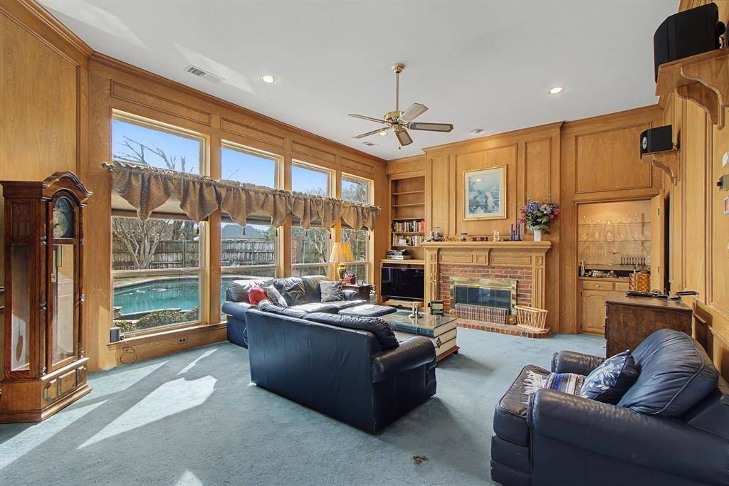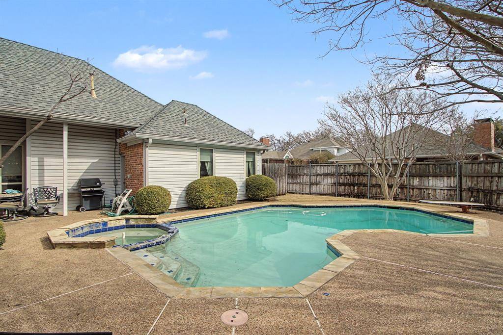 Wonderful one-story home on a corner lot in the highly sought-after Old Shepard neighborhood. This spacious home features 4 bedrooms and 3 full bathrooms, with rear garage access and ample street parking. Step inside to an inviting formal living room with wood floors, vaulted ceilings, large windows, and abundant natural light throughout the main living areas. The living room includes a gas log fireplace, extensive built-in cabinetry, and a wet bar, perfect for relaxing or entertaining. A wall of windows offers beautiful views of the backyard pool. The kitchen is equipped with granite countertops, a SS gas cooktop, built-in double ovens, and generous counter space for meal preparation and gatherings. The private primary suite is located at the rear of the home and features an ensuite bath with separate vanities, a garden tub, and a large walk-in closet. Conveniently located near shopping and dining with quick access to Dallas North Tollway, Preston Road, and George Bush Turnpike.