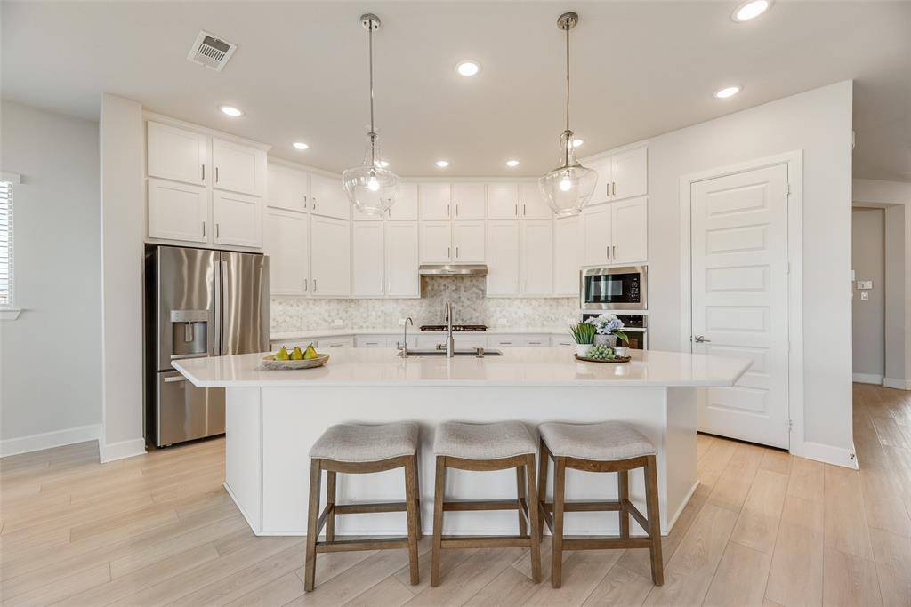 Stunning, move-in ready 4 bedroom, 2.5 bath home on a huge oversized lot in Frisco just minutes from beautiful Lake Lewisville. Walk in to a spacious open concept living dining kitchen area ideal for families and entertaining friends. Gorgeous, durable light grain luxury vinyl plank floors with crisp white paint throughout the first floor are a blank palette for the new owner. A quiet first floor study with ceiling fan, closet and glass French doors sits off the entry just past the built-in mudroom. Dream kitchen with endless countertop work space and double stacked upper cabinets for extra storage. The kitchen features gorgeous quartz counters, large eat island, pantry and stainless steel appliances including 5-burner gas cooktop with built-in oven & built-in microwave. The second floor boasts 4 spacious bedrooms and a second living room flex space. The primary suite features lots of natural light, a sitting area, large walk in closet and ensuite bath with dual sinks, garden tub, shower and private water closet. The utility room is conveniently located on the second floor with all the bedrooms, no lugging laundry up and down the stairs in this two story home. Huge backyard with wood privacy fence and tons of space to customize the space how you want. Great location just a few minutes from Lake Lewisville and a few miles from all the shopping and restaurants and fun at Stonebriar & Grandscape.