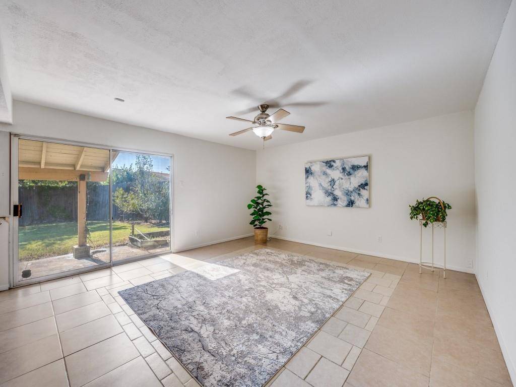 Inside, an open and inviting floor plan offers two spacious living areas, including one with an elegant white brick fireplace. The dining room flows seamlessly into a gourmet kitchen with granite countertops, stainless steel appliances, a high bar, and a sunny eat-in breakfast area.
