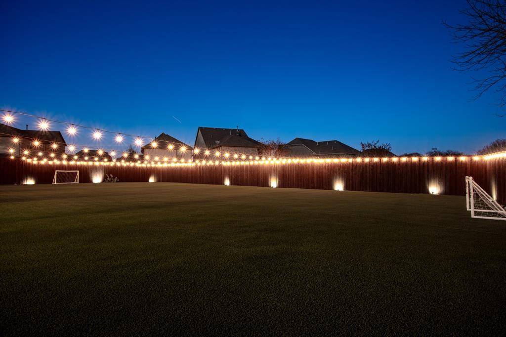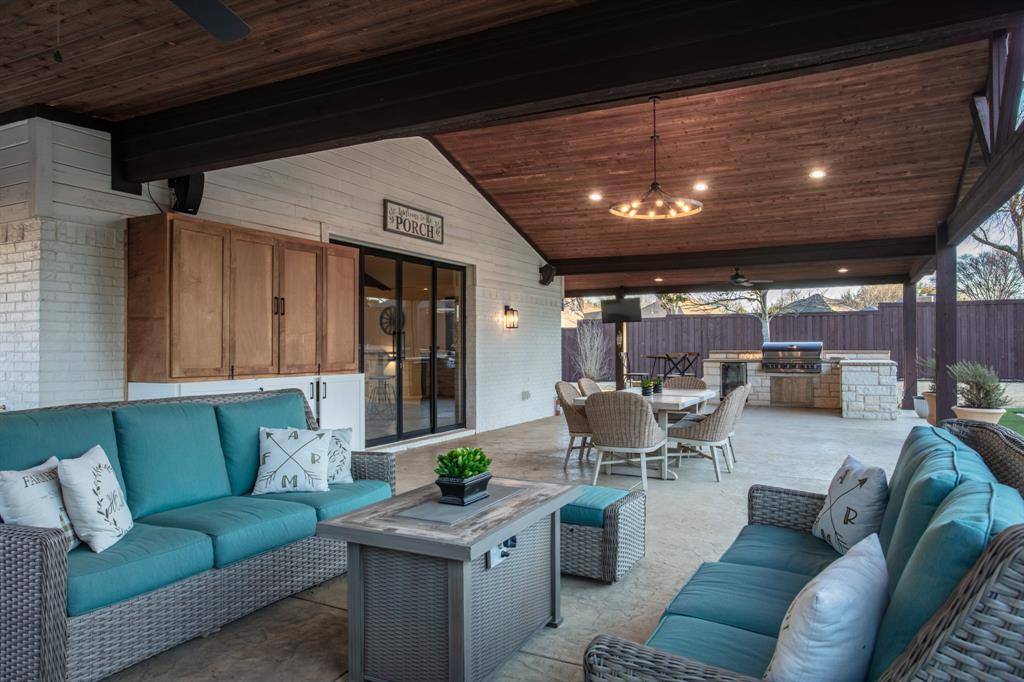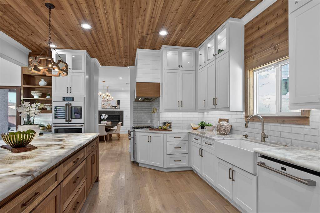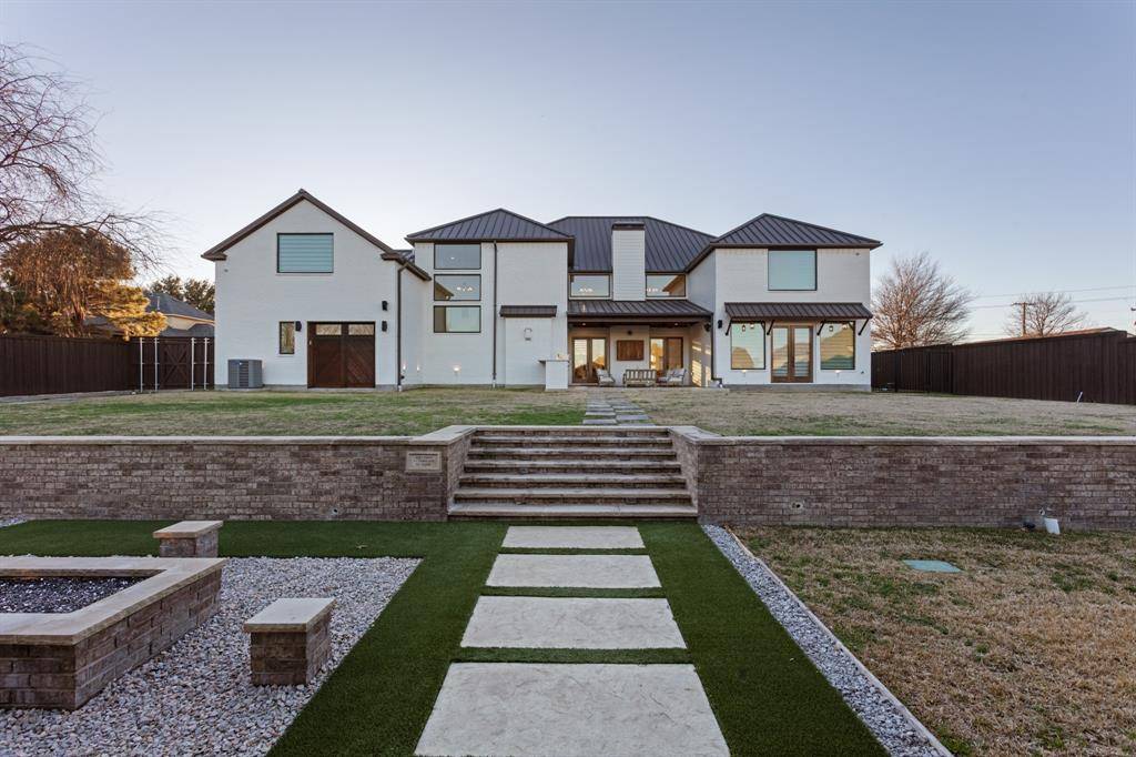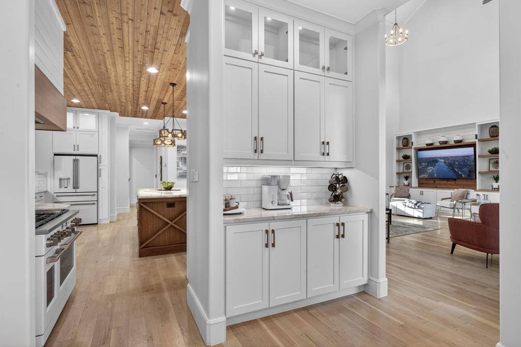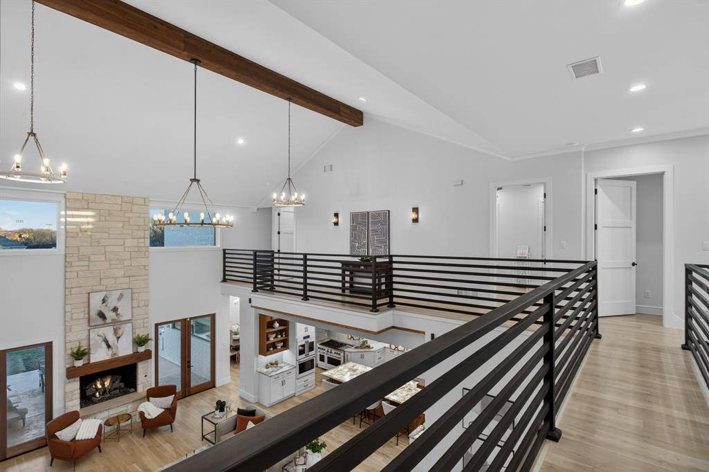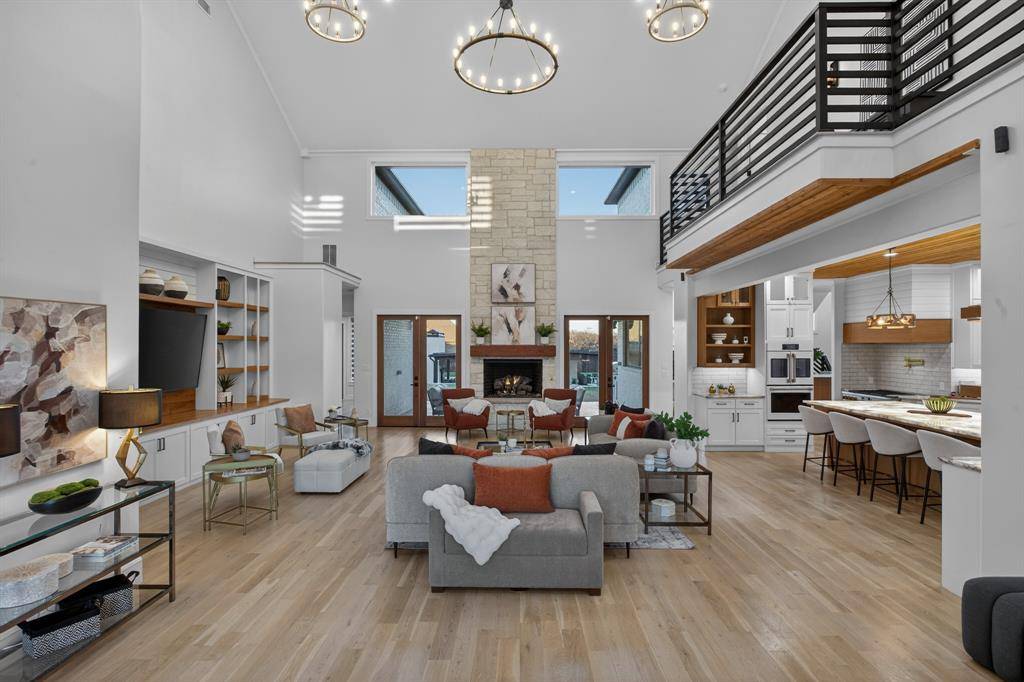 This exceptional custom estate blends architectural sophistication, refined finishes, and modern smart-home technology across a stunning main residence and an expansive guest home. A circular stamped-concrete drive, covered entries, and eight-foot cedar fencing create striking curb appeal and privacy from the moment you arrive. Inside, hand-laid 5-inch white oak hardwoods, soaring 28-foot vaulted ceilings, and an Austin White stone gas fireplace set the tone for elevated living. Entertain effortlessly with a quartz-topped bar beneath the back staircase, a statement dining room with shiplap accent wall and Taj Majal quartzite coffee bar, and a chef's kitchen featuring an oversized Cristallo quartzite island, pot filler, and professional-grade appliances. The spa-inspired owner's retreat offers marble finishes, a rainfall shower, and a custom walk-in closet with center island, while secondary bedrooms provide private baths, walk-in closets, and 10-foot ceilings. A private theater with concealed entry, dedicated office, and designer laundry room add both luxury and functionality. Outdoors, enjoy a professionally designed backyard with premium turf, basketball court, and a covered, ventilated porch complete with dual gas grills, fire pit, and wood-burning chimney, prepped for a future luxury pool. The approximately 2,202 sq. ft. guest house with separate utilities is ideal for multigenerational living or entertaining. Built for performance and peace of mind, the home features an engineered slab foundation, closed-cell foam insulation, hail-resistant metal roof, dual high-efficiency zoned HVAC systems, whole-property Generac generator, tankless water heaters, smart irrigation, EV-ready oversized garage, and integrated smart security. A rare opportunity to own a truly distinguished, resort-style estate where timeless design meets modern innovation.