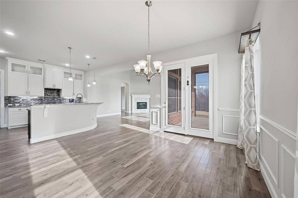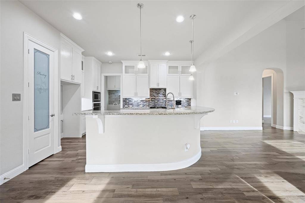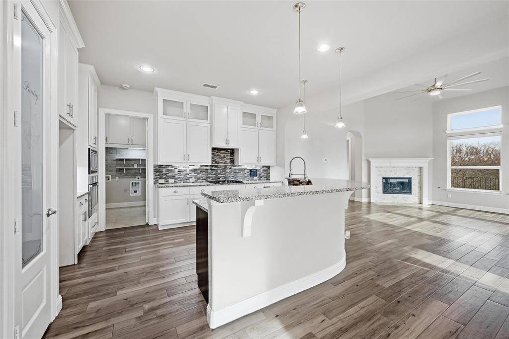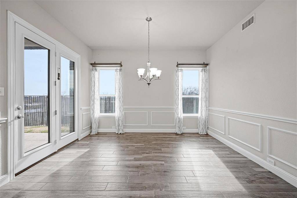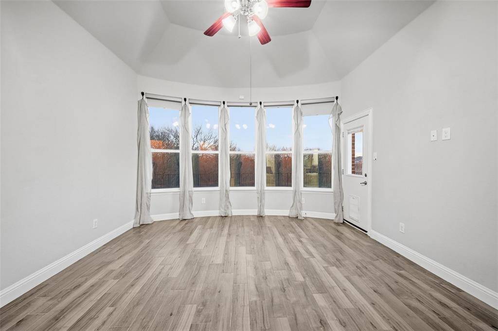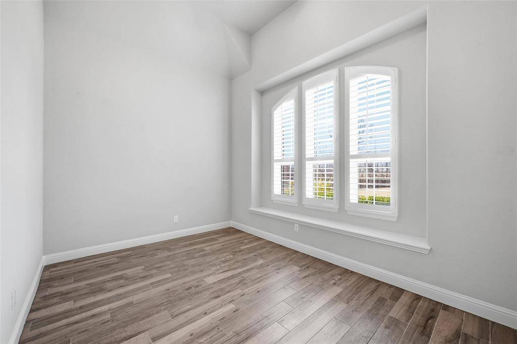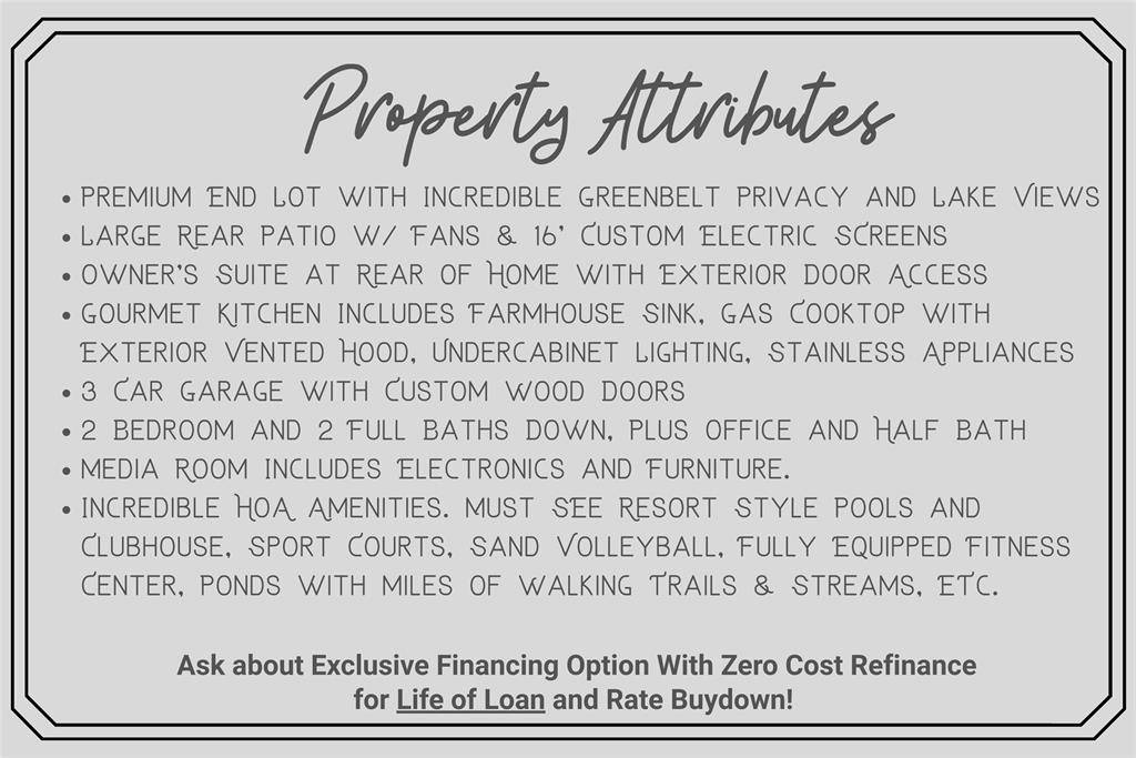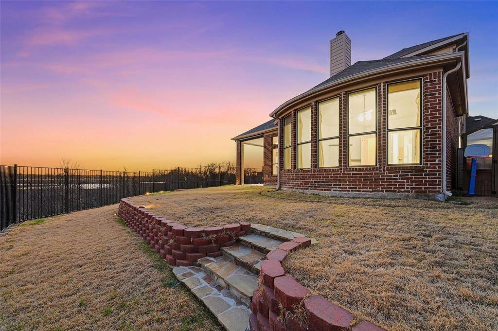 ***Open House Sunday from 12 to *** This highly desirable 4-bedroom, 4.5-bath layout with a 3-car garage is positioned on a premium greenbelt lot backing to U.S. Army Corps of Engineers land at Lake Lewisville. Situated in the Frisco's Lone Star Ranch community, the home showcases dramatic ceilings, plantation shutters, upscale wood-look tile flooring, a gas fireplace, spacious game room, and a media room enhanced with upgraded lighting and surround-sound wiring. The chef's kitchen is outfitted with granite surfaces, stainless steel appliances, custom floor-to-ceiling cabinetry with glass accents for added light, a convection microwave oven, five-burner gas cooktop, walk-in pantry, farmhouse sink, under-cabinet lighting, and a tankless water heater. Thoughtful details include pull-out shelving in all lower cabinets and a built-in trash drawer. The primary retreat enjoys tranquil greenbelt views, direct patio access, and a spa-inspired bath featuring dual vanities, a frameless walk-in shower with stone bench, soaking tub, and a generously sized split closet. Each secondary bedroom includes its own ensuite bath, with two bedrooms conveniently located on the main level. The backyard is designed for relaxation with a covered patio, two 16-foot motorized solar shades, and a propane fire pit. The garage offers overhead storage, attic access, dual openers, and custom lighting. Quietly tucked on a corner lot with only one adjoining neighbor. Lone Star Ranch residents enjoy miles of trails, a playground, resort-style two-story pool with slide, splash pad, pavilion, and a modern fitness center. An ideal retreat for those seeking privacy, scenic surroundings, and refined living.
