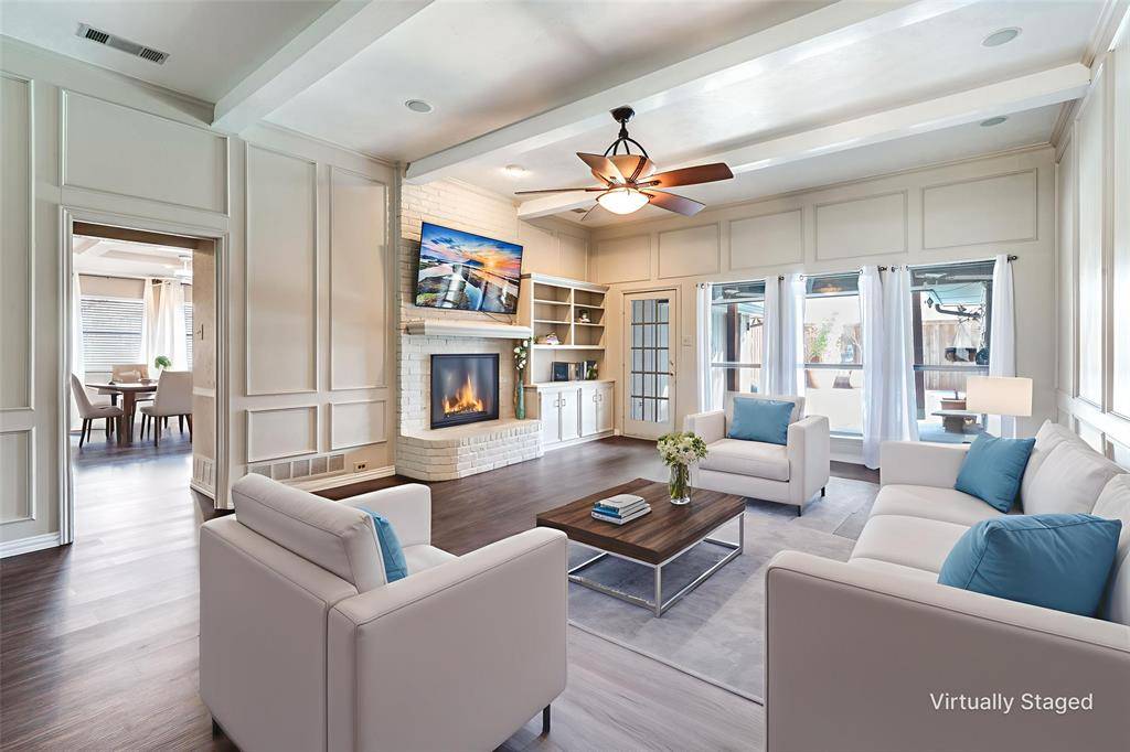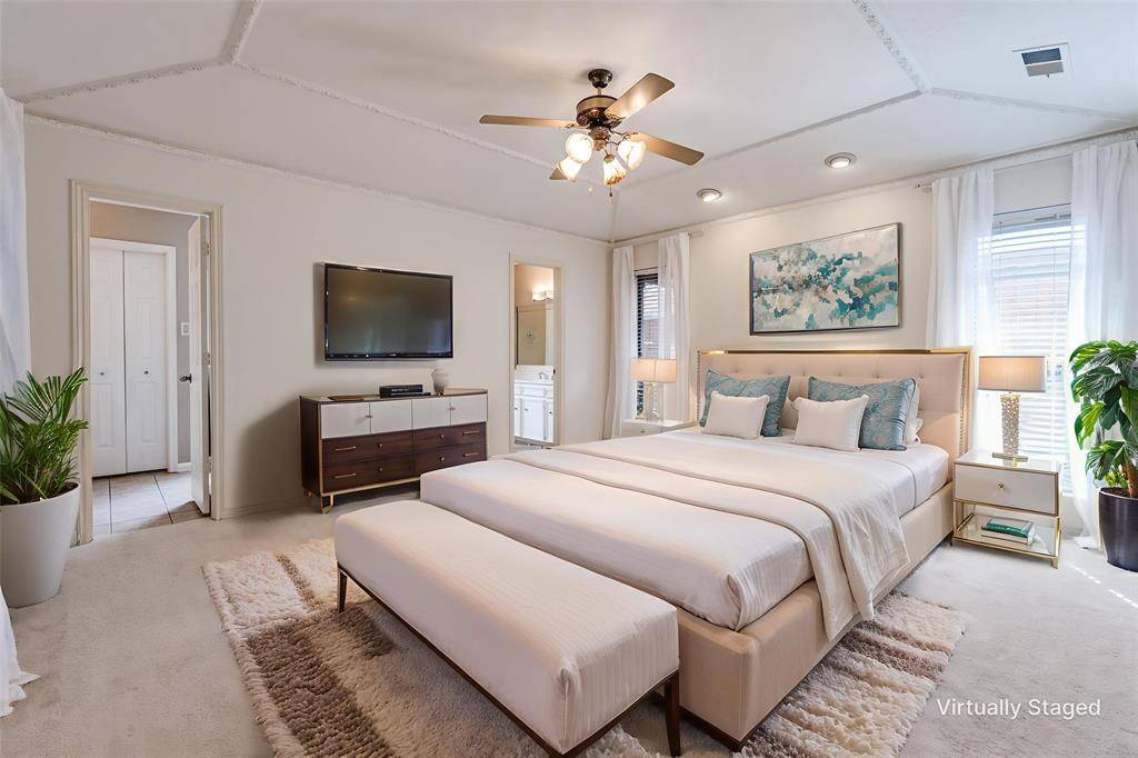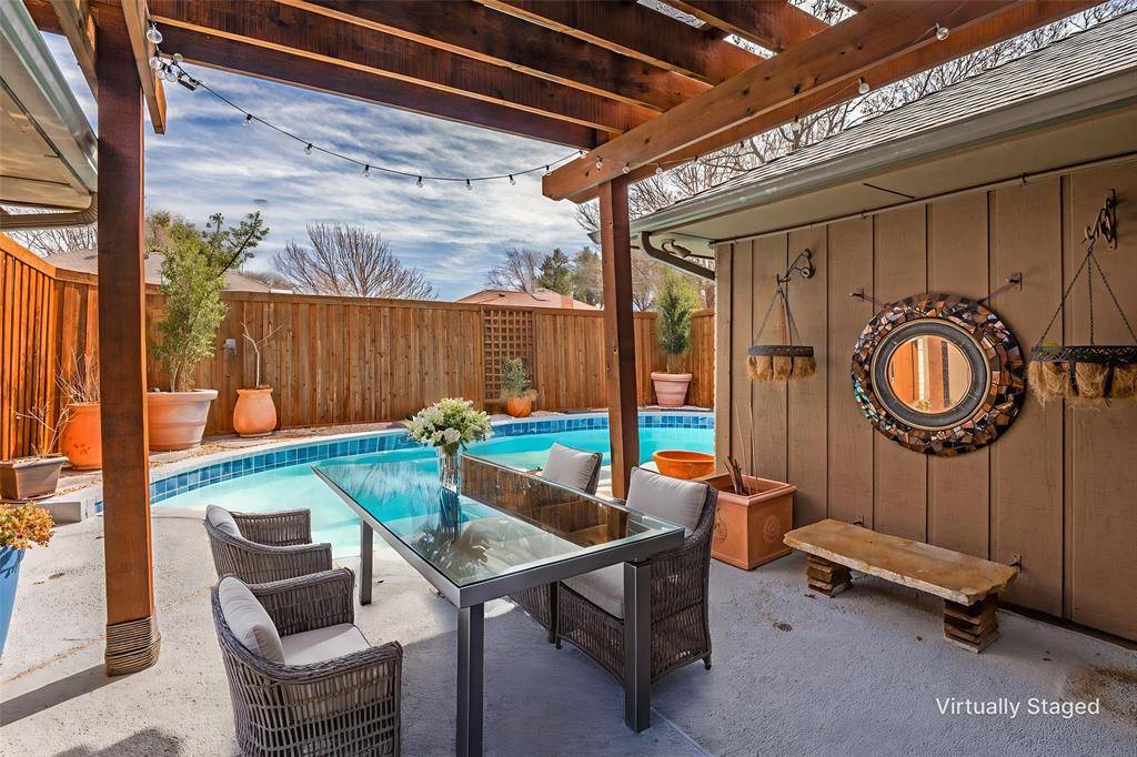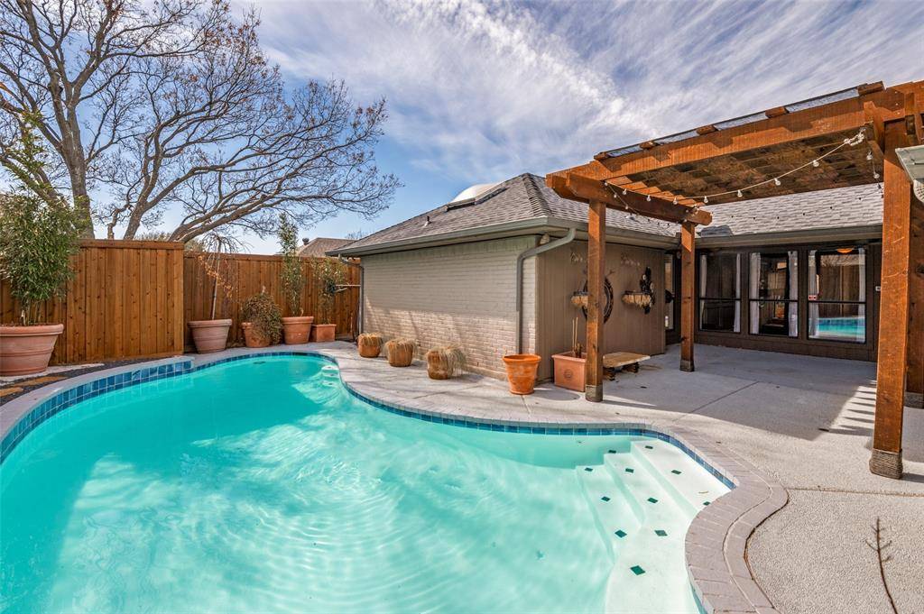 Location, location! Located near downtown Addison, with Carrollton-Farmers Branch ISD this meticulously maintained single-story 3-bedroom, 2.5-bath home on a semi-cul-de-sac with a circular drive and sparkling pool is a must-see. The home features a spacious living room with a fireplace and surround sound, along with a bonus room and wet bar that can be tailored to fit your lifestyle. The kitchen offers stainless steel appliances, an island, double ovens, granite countertops, and an eat-in breakfast area. The home faces east and west, providing excellent natural light throughout the day. Professionally landscaped with flagstone and pebble pathways, the backyard is an entertainer's dream featuring a private pool, covered patio, three-car carport, and a private dog run. The two-car garage includes epoxy flooring, a separate heating and cooling unit, and built-in shelving. Additional features installed in 2023 include a roof, solar screens, two storage sheds, and all large planters outside conveying with the property. Ideally located close to retail, dining, and major freeways. NO HOA!