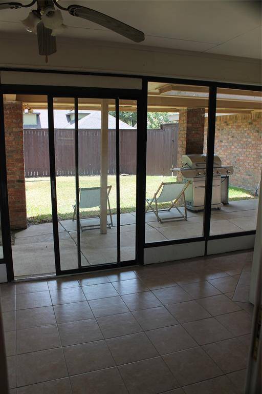 Nicely updated 3 bedroom, 2 bathroom, home with 2 garage spots close to neighborhood park. Covered front porch, tall vaulted ceilings, wood burning fireplace in a huge living room that flows well to dining room and eat-in kitchen. Tiled sunroom is great as a hobby or playroom. Covered patio overlooks grassy backyard with tall privacy fence. Detached garage has room for 2 cars and storage. Large master has walk-in closet, ensuite bathroom, and access to covered patio. Available early April.