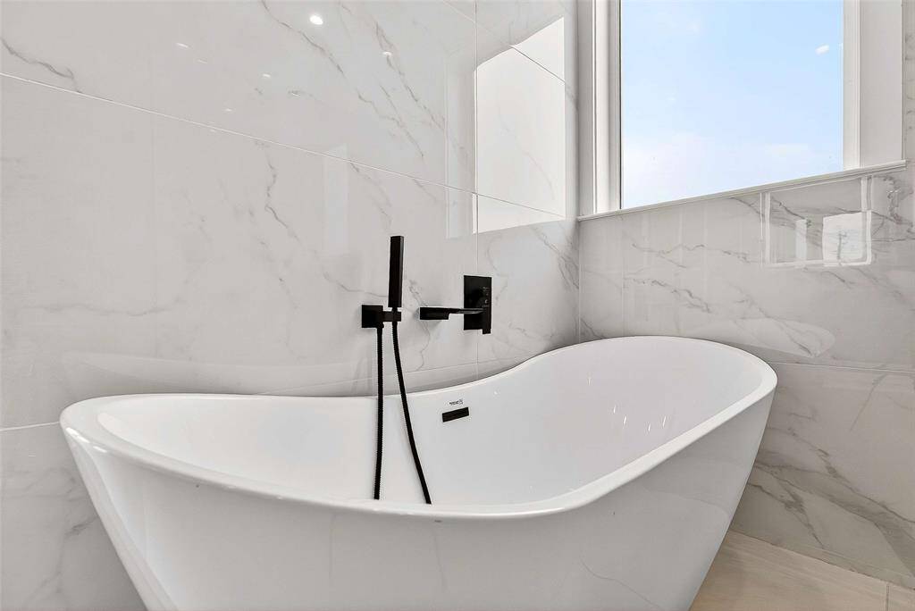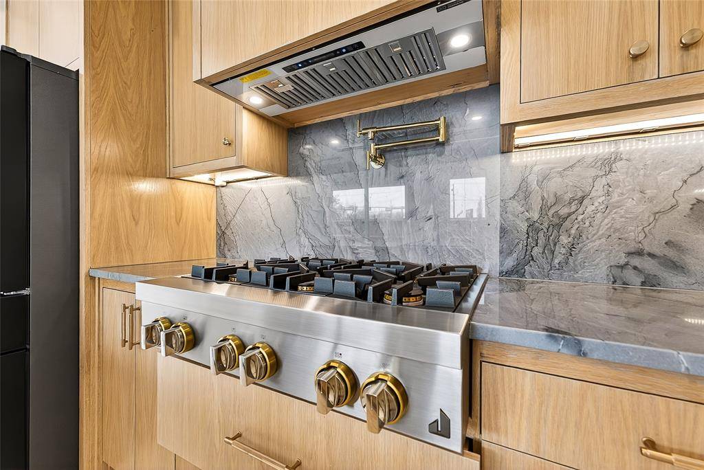 Step inside to find expansive large-format porcelain tile flooring, designer lighting throughout, and an open-concept layout ideal for both everyday living and entertaining. The gourmet kitchen is a true showpiece, featuring quartz countertops and a full quartz backsplash, gas cooktop, built-in oven and microwave, pot filler, and abundant cabinetry for storage.
