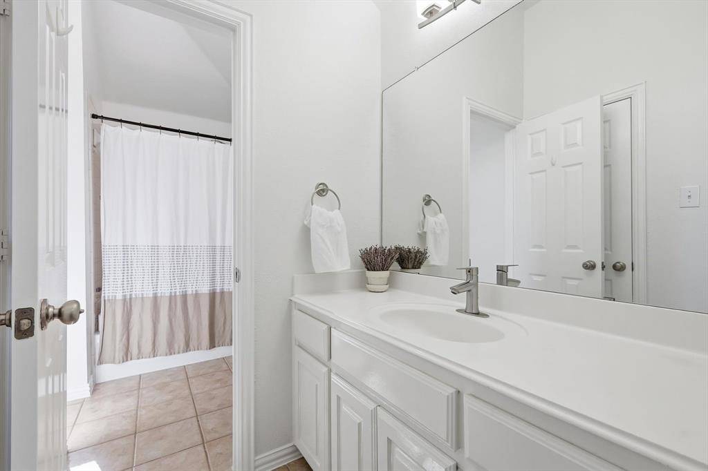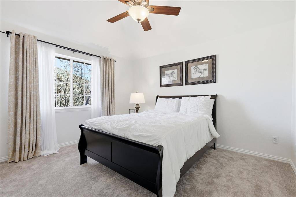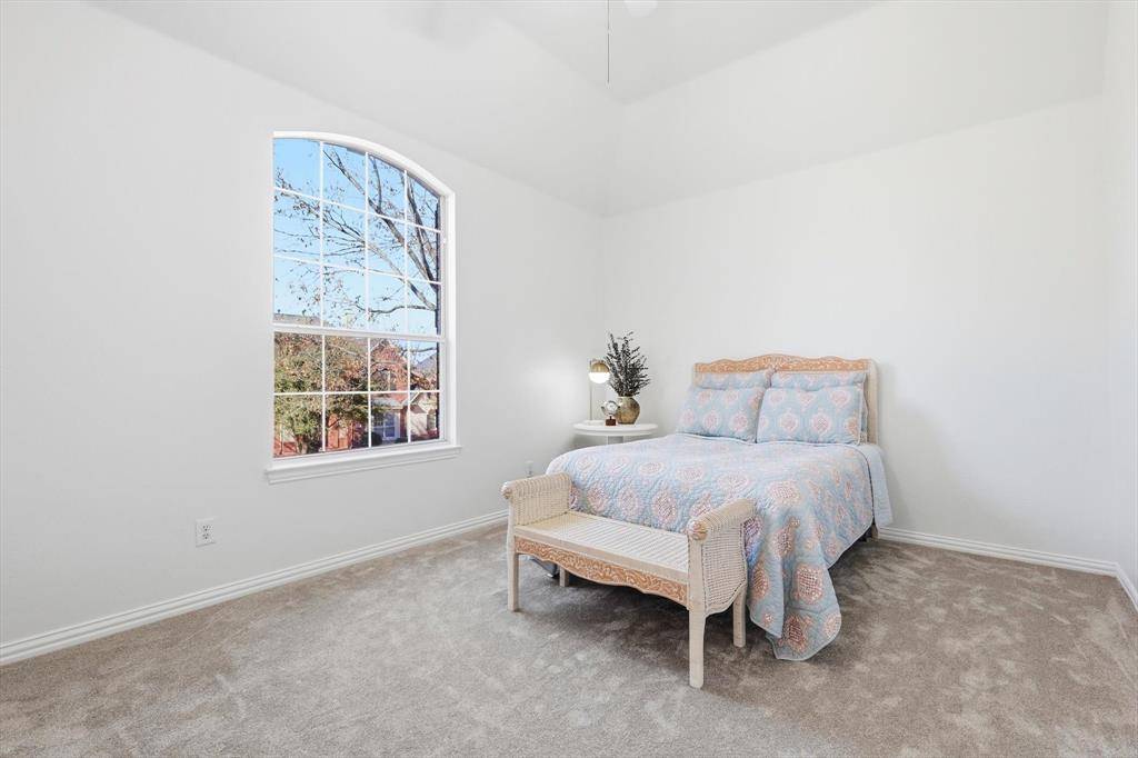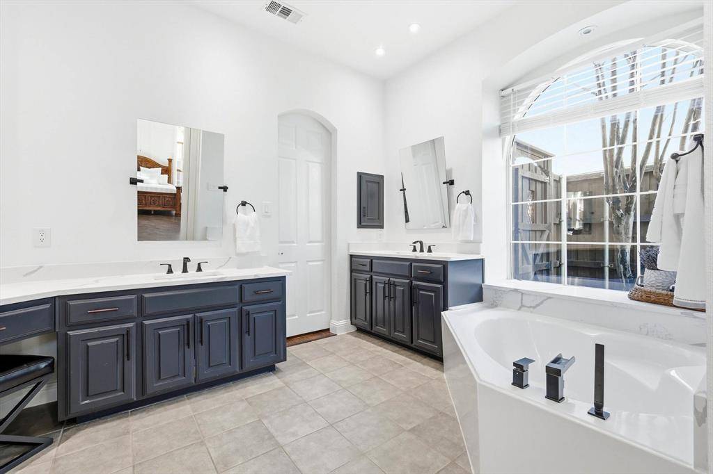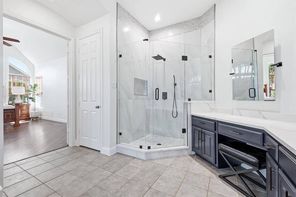 The Primary Suite is TEXAS SIZED at 21 by 14 with Vaulted Ceilings. A Serene Retreat. SCALE THAT GIVES YOU OPTIONS. Space for a True Sitting Area. The Remodeled Bathroom Has a Glass Shower, Rain Head, Dual Vanities, a Dedicated Makeup Vanity, Large Custom Mirrors, & Soaking Tub. Thoughtfully Upgraded.