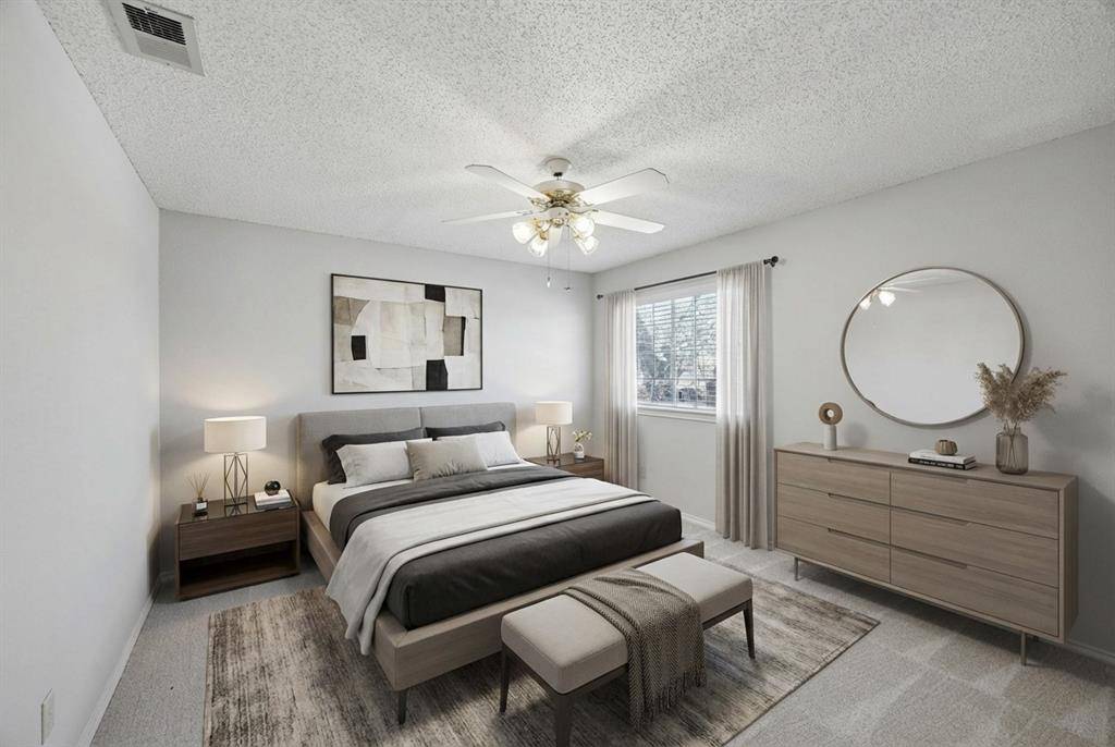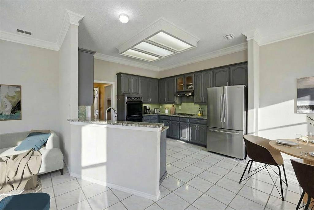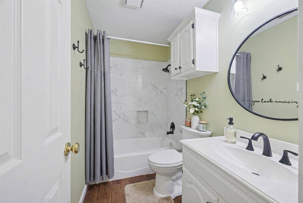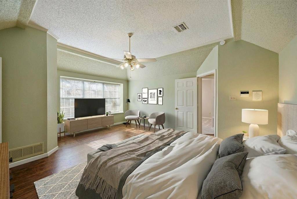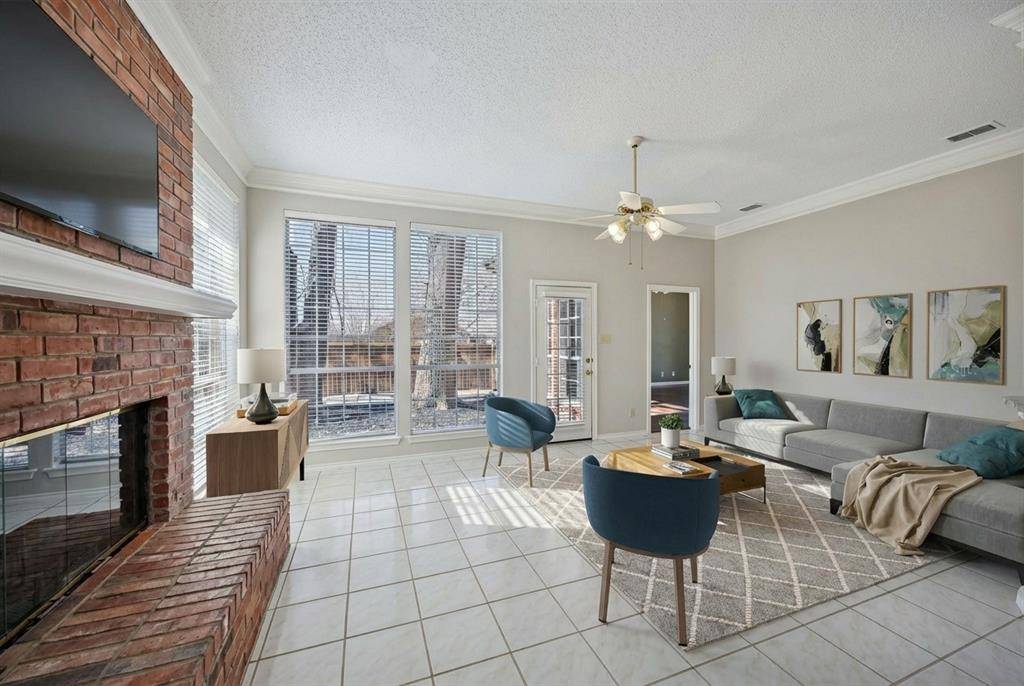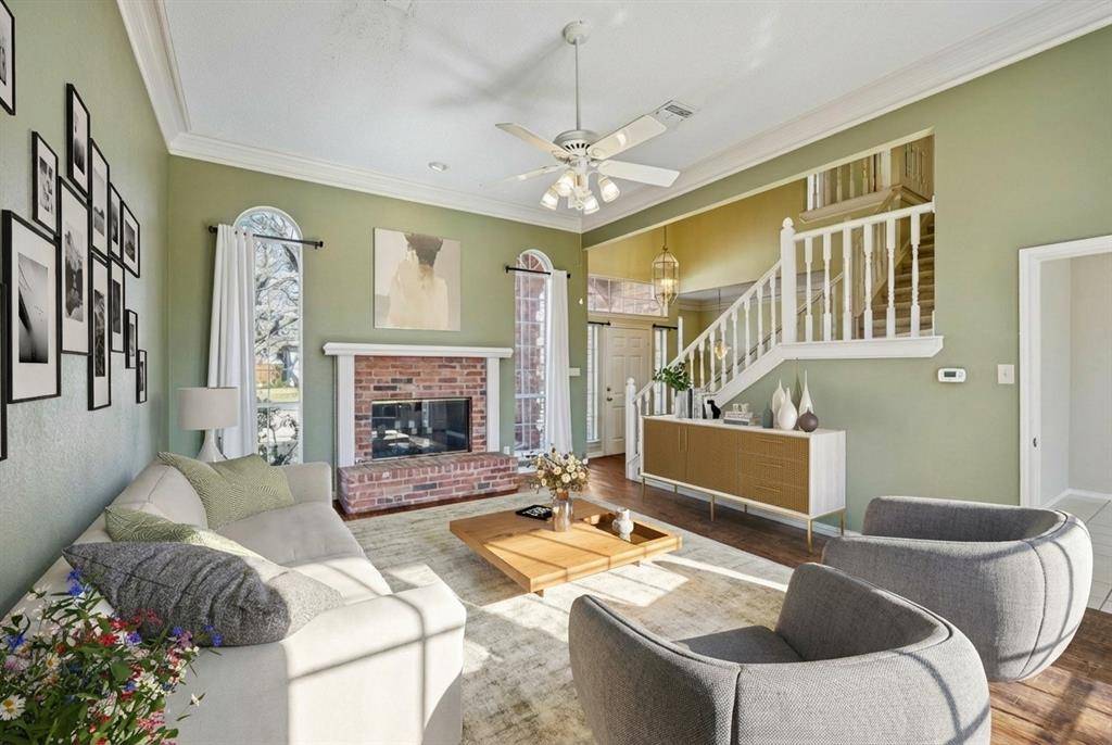 This beautifully maintained brick home offers timeless curb appeal and a warm, inviting interior designed for both everyday living & entertaining. Mature trees & manicured landscaping frame the stately façade, while the arched entry creates a welcoming first impression. Inside, you're greeted by rich hardwood floors, soft natural light, & an open, airy layout. The main living area features soaring ceilings, a classic brick fireplace, & expansive windows that fill the space with sunlight. Neutral tones & elegant finishes create a comfortable yet refined atmosphere. The kitchen is both functional & stylish, showcasing abundant cabinetry, generous counter space, & a seamless connection to the breakfast area. Multiple living & dining areas provide exceptional flexibility, whether you're hosting gatherings or enjoying quiet evenings at home. The spacious rooms, thoughtful layout, & cohesive design make the home feel both comfortable & well-proportioned. The main floor guest bed offers a comfortable & welcoming retreat, thoughtfully designed w- Soft neutral tones, plush carpeting, & natural light create a calm, relaxing atmosphere ideal for guests & enjoy easy access to a well-appointed full bath. The primary suite is designed w-comfort & versatility in mind. Vaulted ceilings create an open, airy feel, while large windows invite in abundant of natural light. The generous layout easily accommodates a full bedroom setup along w-a sitting area, providing flexibility for a private lounge, reading nook, or workspace. The beautifully updated primary bath delivers a true spa-like experience. A freestanding soaking tub serves as a striking focal point, complemented by a large glass-enclosed shower featuring modern tile work & sleek fixtures. Crisp white cabinetry, updated hardware, & contemporary lighting add a fresh, polished aesthetic. This backyard truly stands out for its size, established trees, & flexible outdoor living potential - a highly desirable extension of the home.