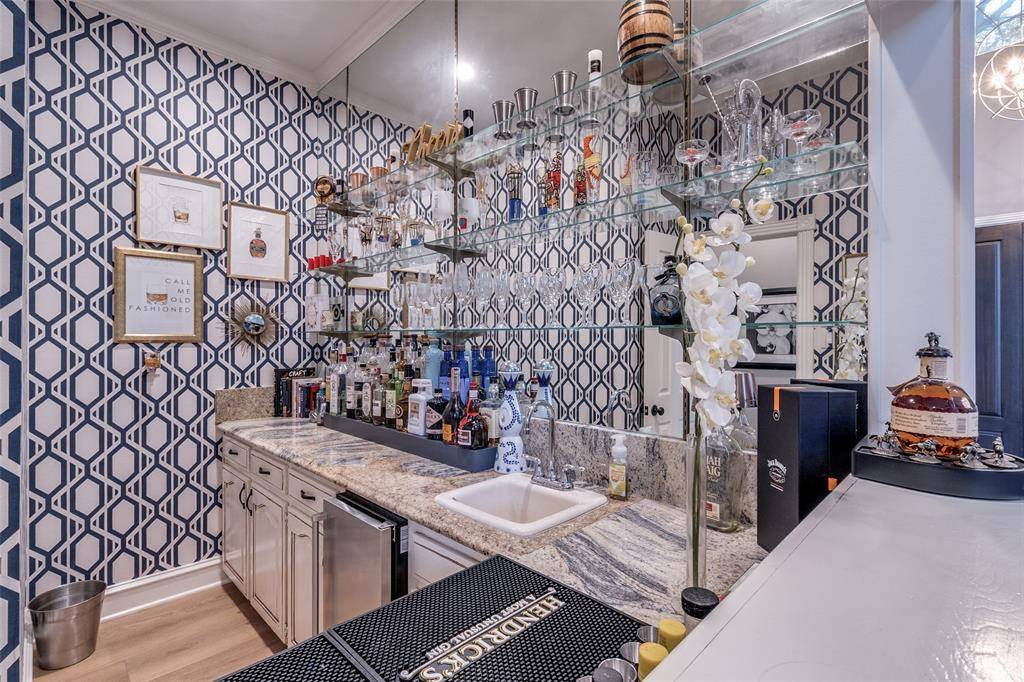 Tall ceilings and abundant natural light enhance the open, functional layout. The redesigned kitchen anchors the main spaces with quartz countertops, a waterfall island, stainless steel appliances, generous cabinetry, and a well-appointed butler's pantry offering added storage and flexibility. A wet bar supports seamless hosting. The primary suite features a fireplace, sitting area, and direct pool access. The bath includes a soaking tub, oversized shower, dual closets, and abundant cabinetry. Upstairs offers a second living area with balcony overlooking the pool, two additional bedrooms, a full bath, and a quarter bath. Intentional design. Natural light. Effortless poolside living.