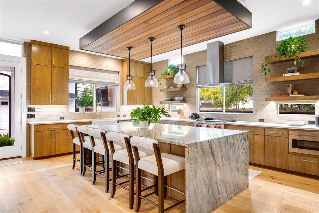 Inside, wide-plank white oak floors, expansive windows, and clean architectural lines create light-filled living spaces designed for both everyday comfort and entertaining. The open kitchen, dining, and living areas are anchored by a striking brick feature wall and a dramatic marble waterfall island. The chef's kitchen is equipped with Wolf appliances, custom cabinetry, generous prep space, and a walk-in pantry.