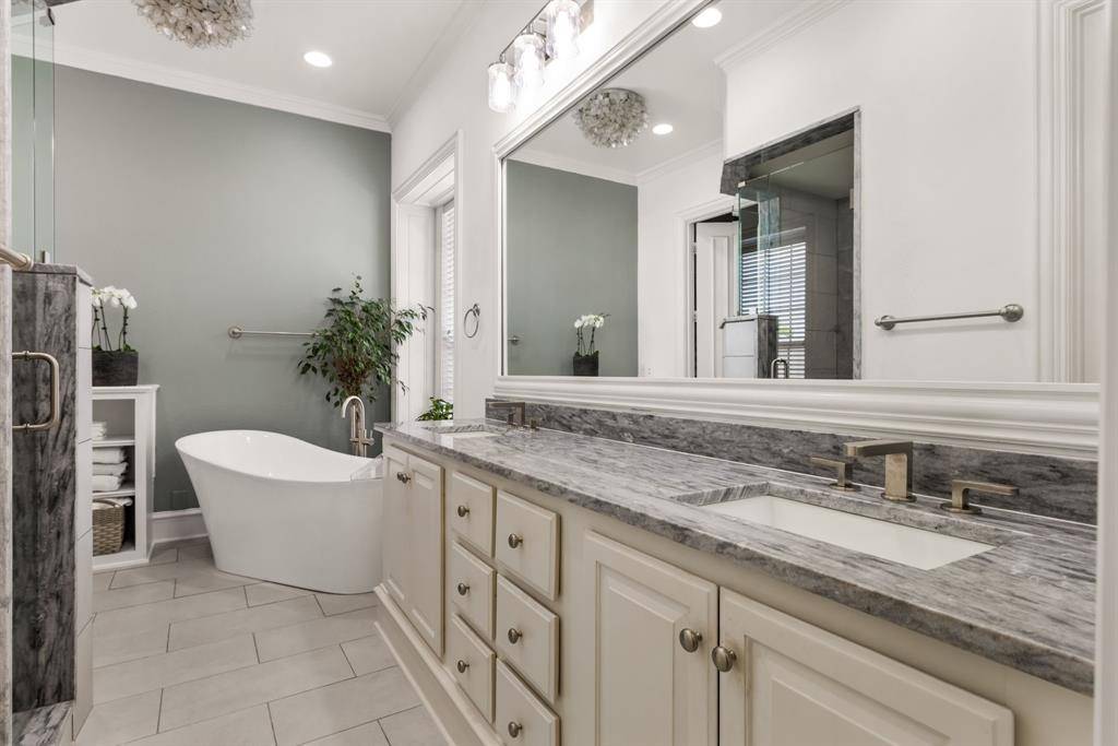 The third floor is devoted entirely to the primary suite, offering generous proportions, soaring ceilings, and a private den with fireplace. The spa-inspired primary bath is beautifully updated with a soaking tub, separate shower, dual vanities, and a large walk-in closet.