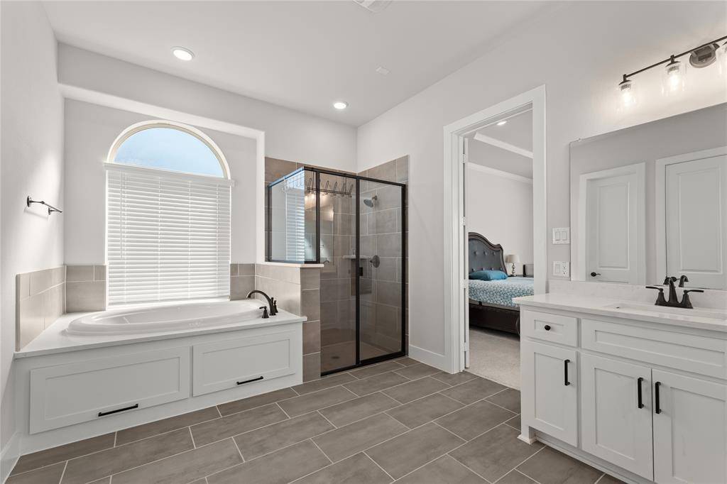 The primary suite offers a private retreat, complete with a rare additional exterior door providing direct access to the covered patio, creating an effortless connection between indoor and outdoor living.