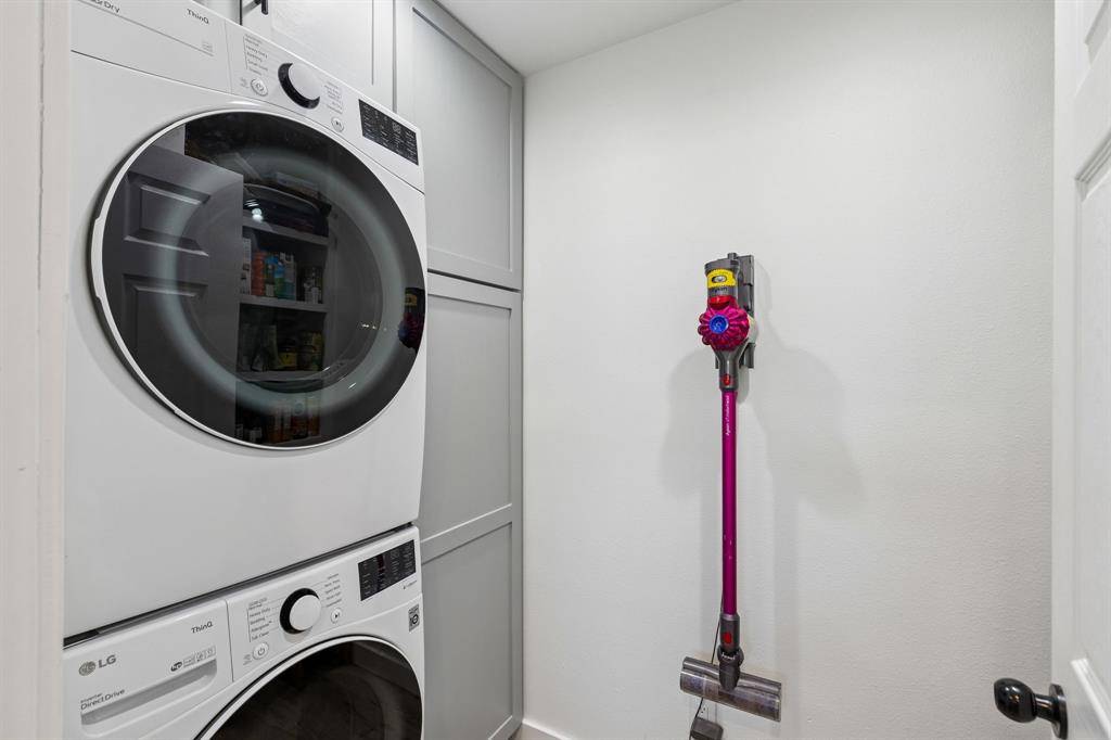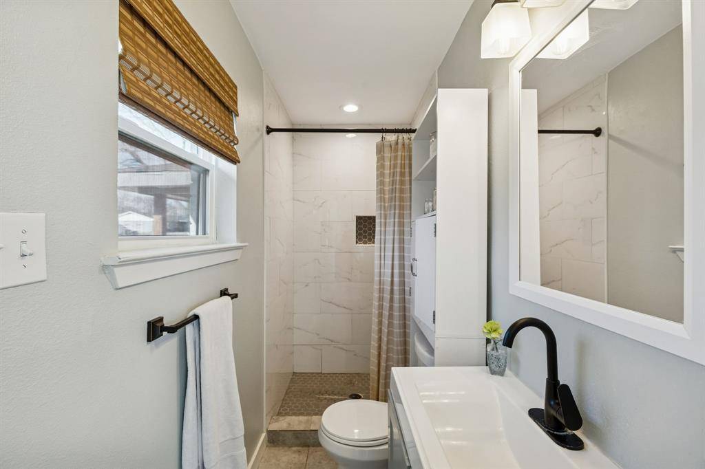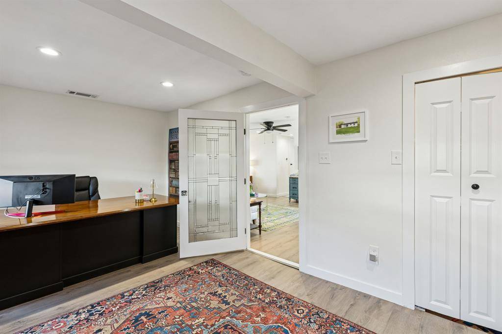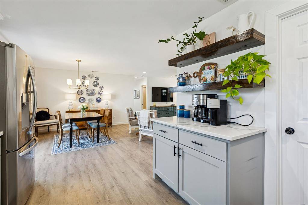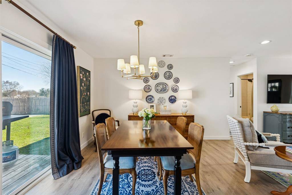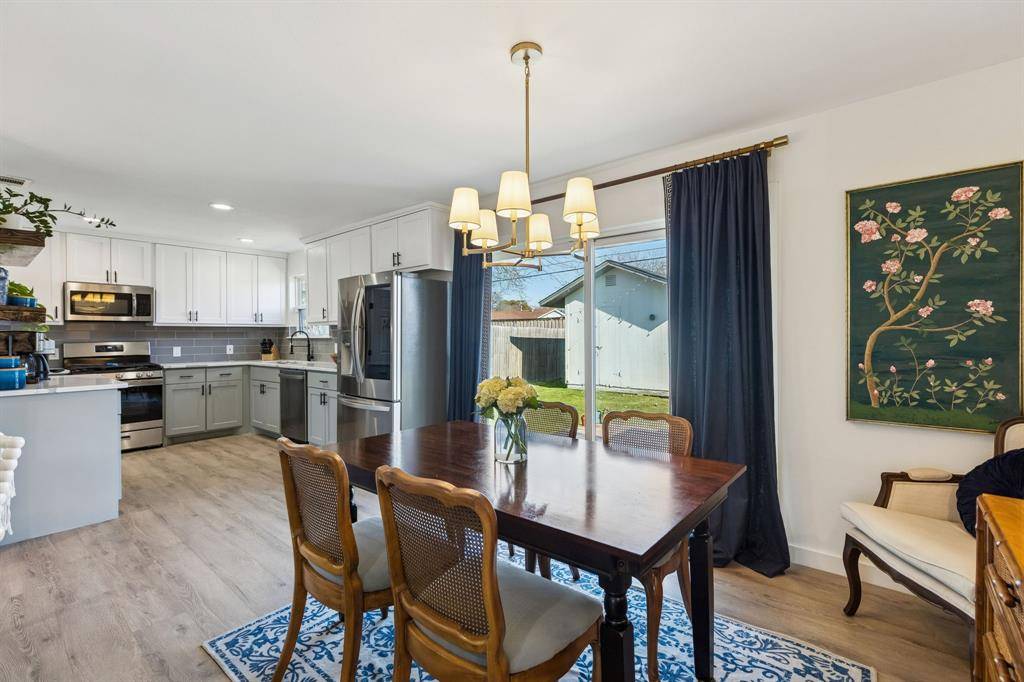 The kitchen is thoughtfully updated with quartz countertops, stainless steel appliances, custom cabinetry, and ample storage. Large windows and a sliding glass door bring in abundant natural light and provide views of the oversized backyard.