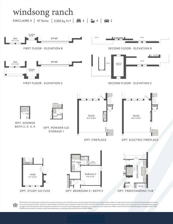 NORMANDY HOMES SINCLAIRE II floor plan. This beautiful 5-bedroom, 5.5-bathroom home is designed to impress with soaring open-to-above ceilings and a cozy electric fireplace in the family room that creates a warm and inviting centerpiece. The main level features the luxurious owner's suite along, with his and her closets, no more arguing over closet space! Also, on the first floor is secondary bedroom and full bath, providing comfort and flexibility for guests or multi-generational living. A private study offers the ideal space for work. Upstairs you'll find 3 more bedrooms and 3 full baths, two of which are on suite. The spacious game room and a dedicated media room are set up for endless entertainment. Throughout the home, custom finishes and stylish details elevate every space, blending modern elegance with everyday functionality. This is a home where comfort, sophistication, and convenience come together beautifully.