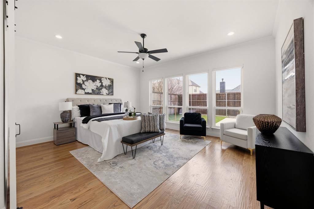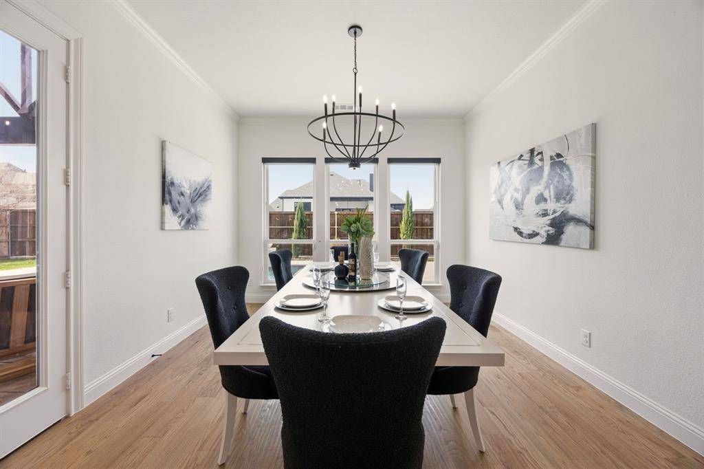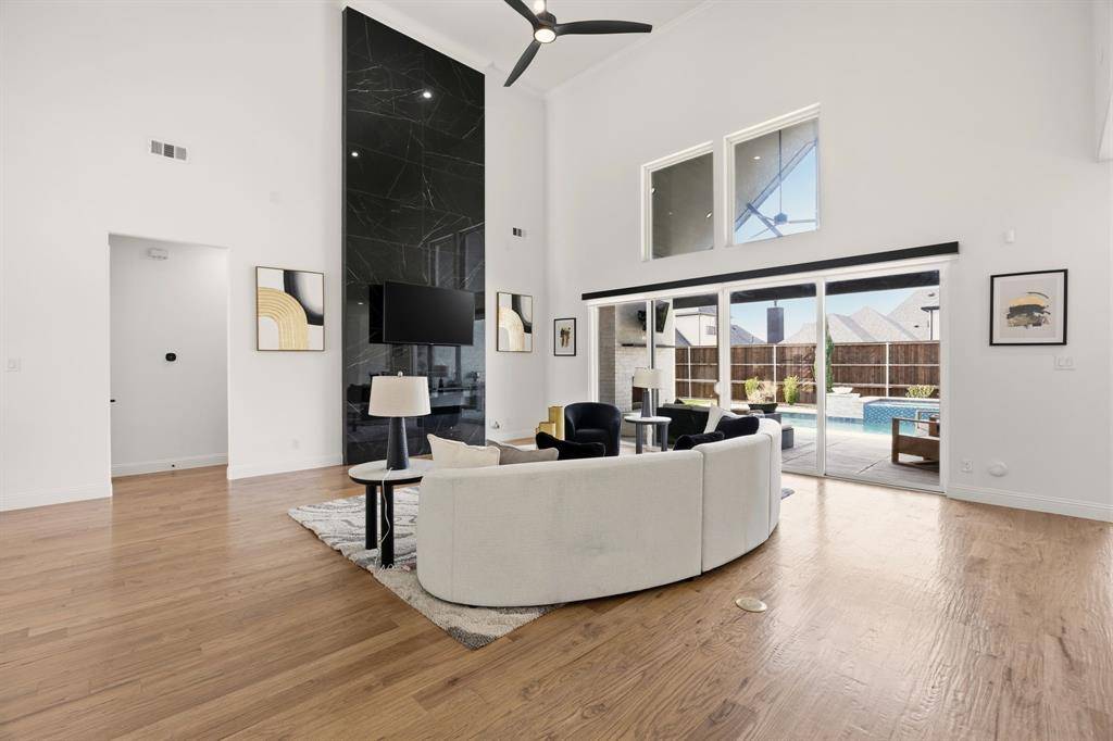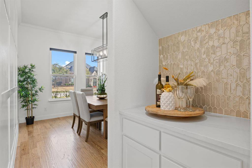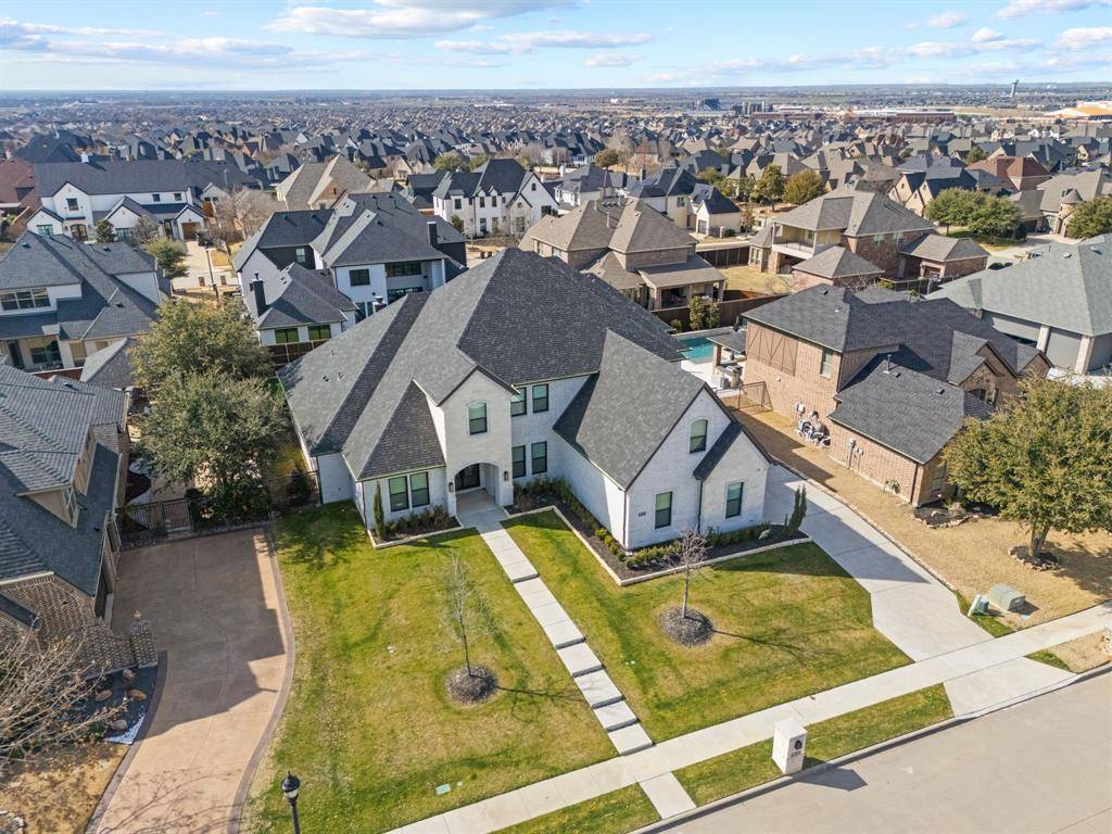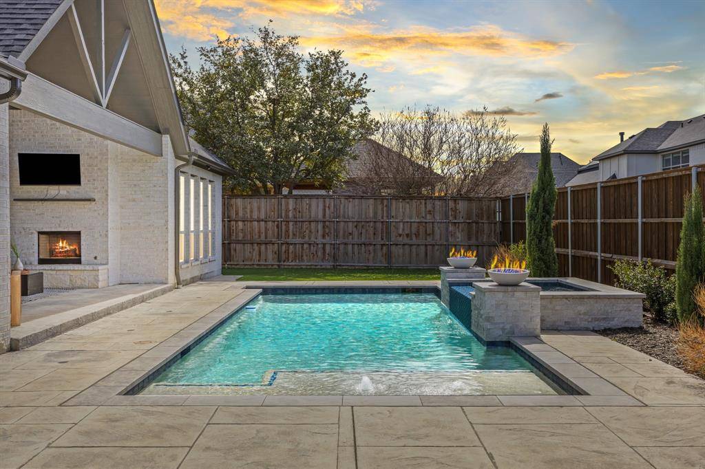 This exceptional two-story white brick and stone estate, located in prestigious Saddle Creek in Prosper, delivers timeless design and true resort-style living. From the moment you arrive, the stately façade and manicured approach set the tone for what's inside. Fresh interior paint completed in 2026 enhances the home's bright, refreshed interior. Rich hardwood floors, soaring ceilings, and extensive crown moulding create a light, elevated feel throughout the main living spaces. A private office offers a refined space for working from home, while the formal dining room and brkfast nook provide flexibility for both intimate dinners and larger gatherings. The kitchen is designed to impress — oversized island with seating for four anchors the space, surrounded by abundant cabinetry and a hidden walk-in pantry that keeps everything beautifully tucked away — space that blends refined design with practical everyday functionality. The primary suite is a true retreat, with expansive windows overlooking the backyard oasis. A sliding barn door leads to the spa-inspired bath featuring a freestanding soaking tub, frameless glass rainhead shower, dual vanities, and thoughtfully selected finishes throughout. A secondary bedroom with dedicated bath is also located downstairs. The utility room is well-appointed with built-in cabinetry and sink for added convenience. Upstairs, a spacious game room with wet bar creates the perfect entertainment lounge. Step outside and the lifestyle truly comes alive. The low-maintenance turf ensures year-round beauty, while the custom pool and spa with cascading waterfall create a private resort-style retreat. Dramatic fire bowls frame the space, creating the perfect setting for unforgettable Texas evenings. Situated in the heart of Prosper with convenient access to premier dining and shopping, and zoned to highly acclaimed Prosper ISD, this home offers luxury, comfort, and a refined lifestyle in one of North Texas' most desirable communities.