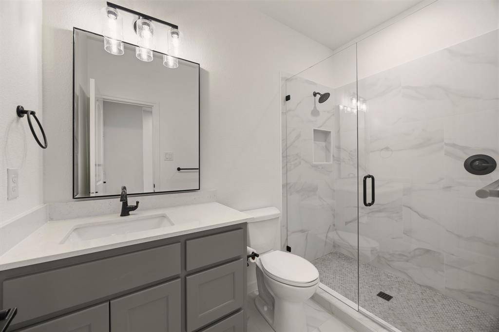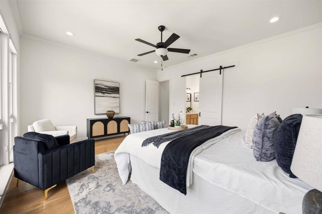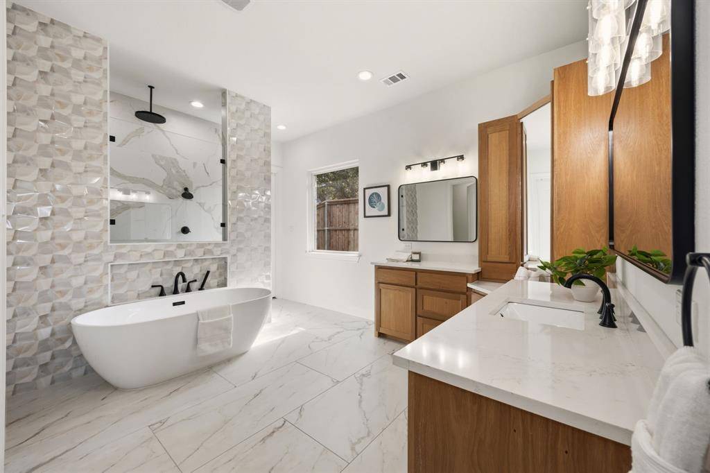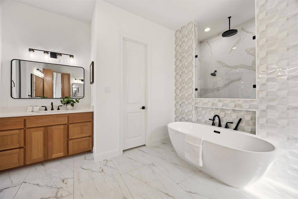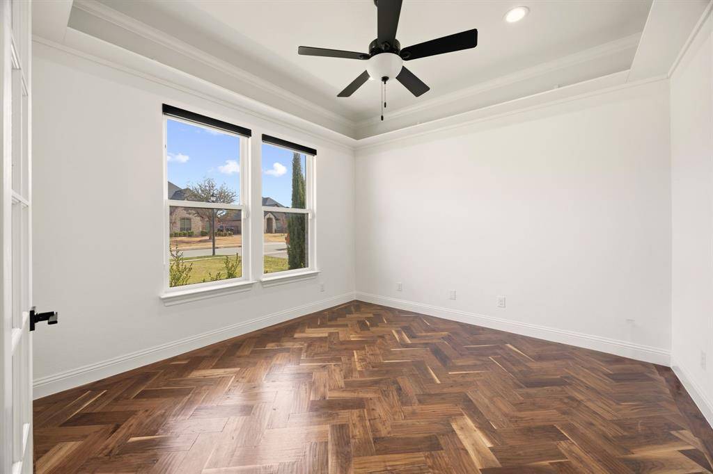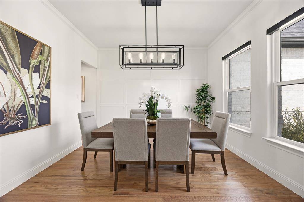 This exceptional two-story white brick and stone estate, located in prestigious Saddle Creek in Prosper, delivers timeless design and true resort-style living. From the moment you arrive, the stately façade and manicured approach set the tone for what's inside. Fresh interior paint completed in 2026 enhances the home's bright, refreshed interior. Rich hardwood floors, soaring ceilings, and extensive crown moulding create a light, elevated feel throughout the main living spaces. A private office offers a refined space for working from home, while the formal dining room and brkfast nook provide flexibility for both intimate dinners and larger gatherings. The kitchen is designed to impress — oversized island with seating for four anchors the space, surrounded by abundant cabinetry and a hidden walk-in pantry that keeps everything beautifully tucked away — space that blends refined design with practical everyday functionality. The primary suite is a true retreat, with expansive windows overlooking the backyard oasis. A sliding barn door leads to the spa-inspired bath featuring a freestanding soaking tub, frameless glass rainhead shower, dual vanities, and thoughtfully selected finishes throughout. A secondary bedroom with dedicated bath is also located downstairs. The utility room is well-appointed with built-in cabinetry and sink for added convenience. Upstairs, a spacious game room with wet bar creates the perfect entertainment lounge. Step outside and the lifestyle truly comes alive. The low-maintenance turf ensures year-round beauty, while the custom pool and spa with cascading waterfall create a private resort-style retreat. Dramatic fire bowls frame the space, creating the perfect setting for unforgettable Texas evenings. Situated in the heart of Prosper with convenient access to premier dining and shopping, and zoned to highly acclaimed Prosper ISD, this home offers luxury, comfort, and a refined lifestyle in one of North Texas' most desirable communities.