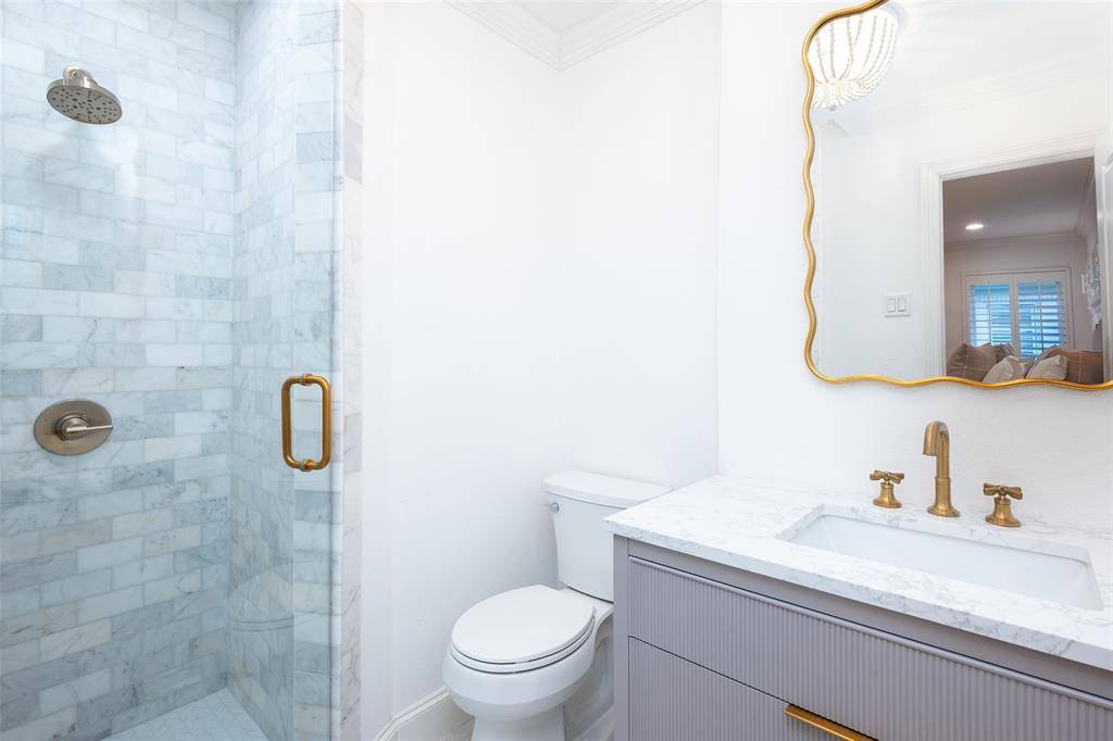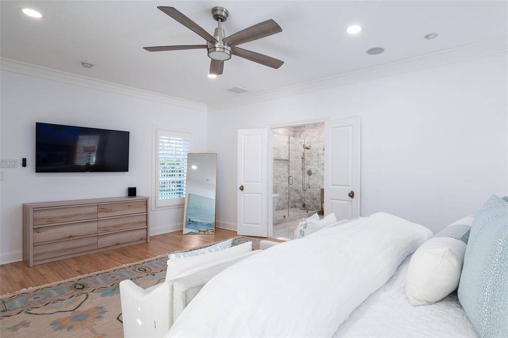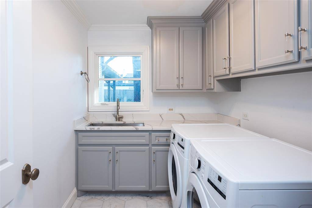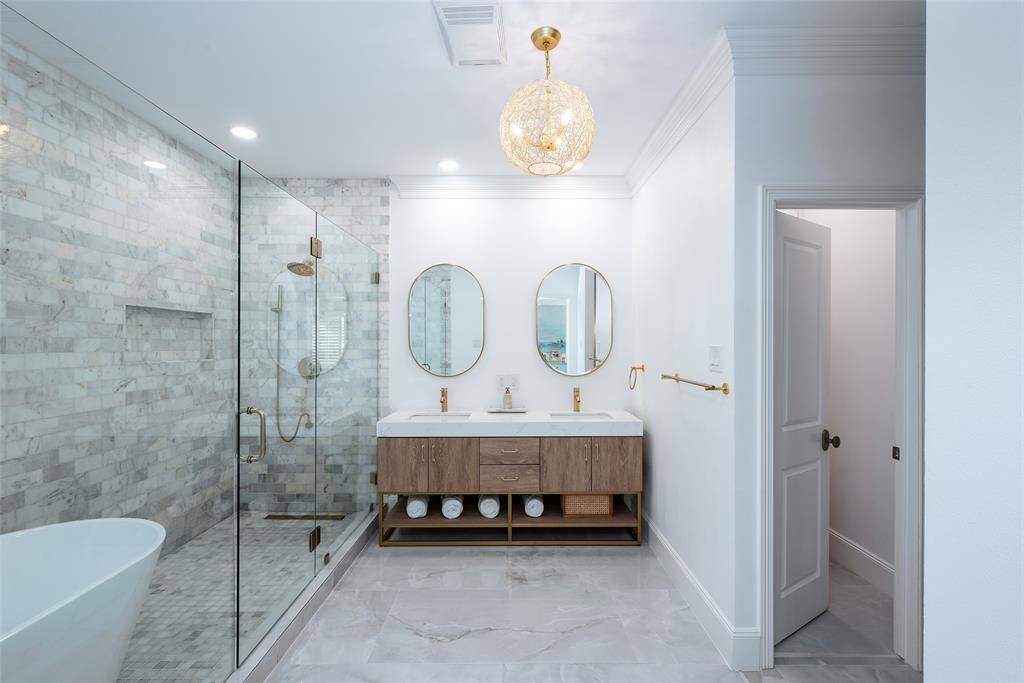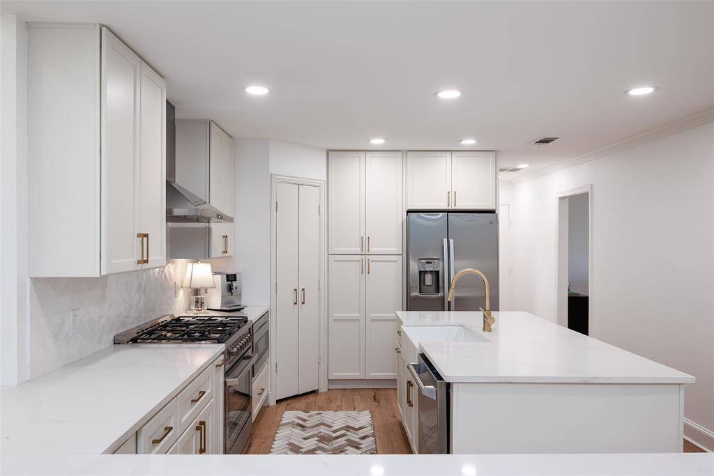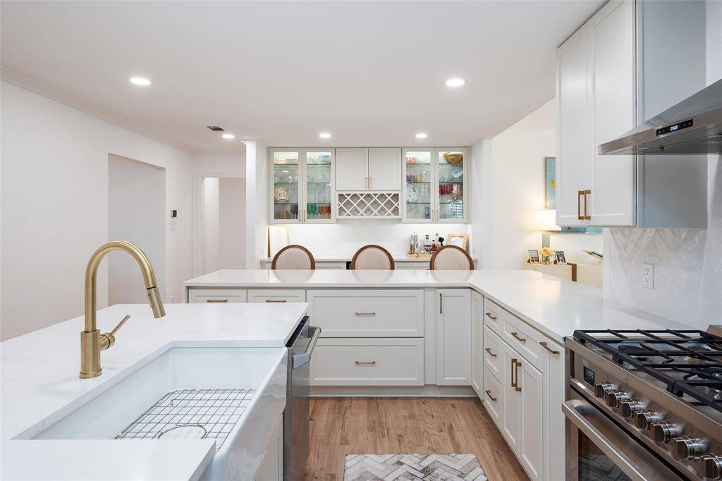 A welcoming fireplace shared between the living and dining rooms creates a warm and inviting space ideal for entertaining guests. The fully renovated kitchen features an expanded island, custom cabinetry with soft-close drawers, stainless steel appliances, and a walk-in pantry. A separate utility room with sink adds additional convenience. Just off the kitchen, a stylish dry bar complete with a wine cooler connects to the spacious family room. This impressive living area features a vaulted ceiling, a second fireplace, and large windows overlooking the expansive backyard and entertainment patio-perfect for gatherings both indoors and out. The large primary suite offers high ceilings and a beautifully updated spa-like bath designed for comfort and relaxation. An intimate exterior courtyard sits between the primary and second bedroom, providing a peaceful outdoor retreat while also offering an excellent opportunity to expand the interior square footage if desired. All three bathrooms have been fully renovated with quality finishes and thoughtful design. Significant recent improvements enhance the home's value and functionality, including updated HVAC, roof, and water heater. Located on a generous lot in one of Dallas' most desirable neighborhoods, this move-in ready Preston Hollow home combines modern updates, timeless style, and exceptional entertaining spaces both inside and out.