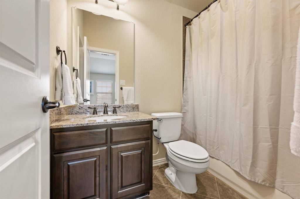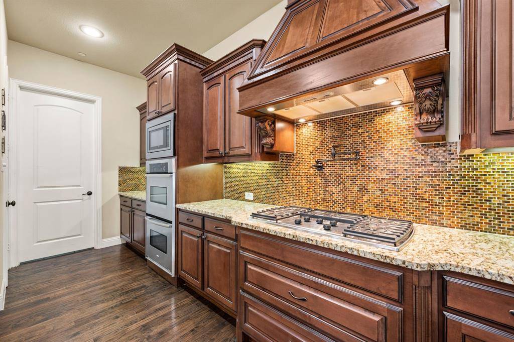 5 BR home loaded with extras! This gem is located in desirable Turnberry at Trophy Club on a N-S lot. Upon entry, the eye is draw up by the extra high ceilings in the foyer and continuing into the formal dining with stained wood beams & stacked windows. There is an oversized study off the entry & an adjacent half bath. The family room boasts soaring ceilings, stacked windows, and stone fireplace. A curved bar opens onto the well-equipped kitchen with W-I pantry, dbl ovens, gas range & pot filler & a generously sized breakfast nook with butlery overlooking the covered patio. This spacious floor plan offers 1st floor primary & guest suites! The primary BR boasts wood hardwood flrs, stacked windows, shutters & a lux bath with tile inlay floor, huge W-I shower, split vanities & master closet designed by Closets by Design. Upstairs are 3 oversized bedrms, 2 full baths (one en suite & one J &J bath), game rm with wet bar and balcony, half bath + media room. The oversized lot offers ample lawn space beyond the saltwater pool with water feature, stamped concrete patio w-remote drop shades, spacious pool deck. Professionally upgraded landscaping. Notable extras: Roof replaced 2024, 50 amp plug in garage, water softener, Jellyfish custom holiday lights, 2 tankless w-h. Easy access to Hwy 114 & 170.