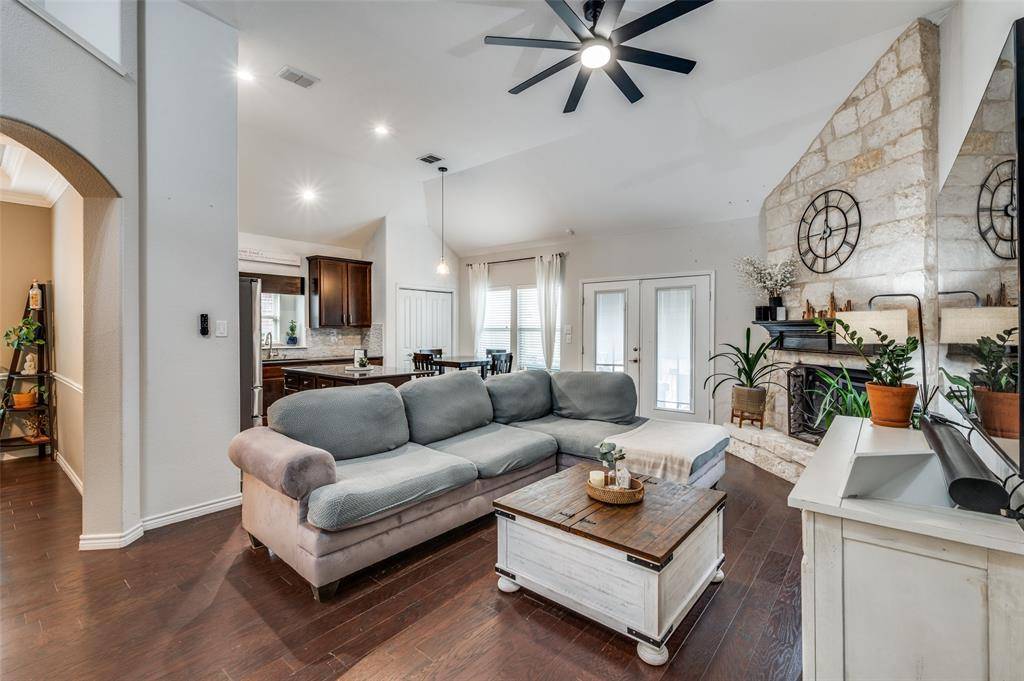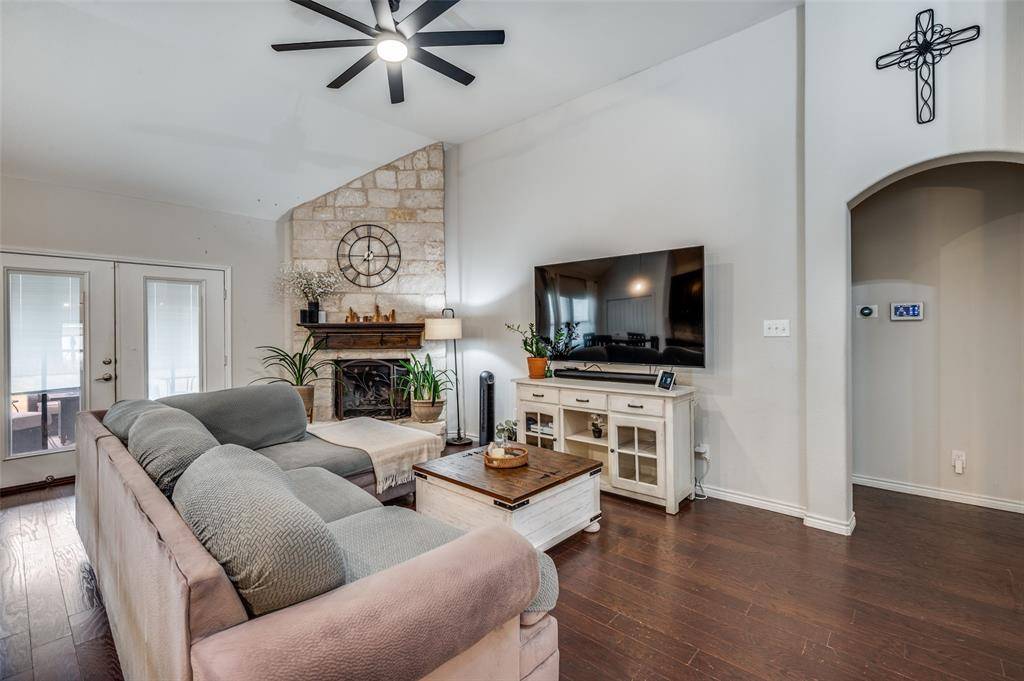 Open House this Sunday, March 15th 1-3pm. Beautiful one-story home located in the gated community of The Shores at Hidden Cove! This inviting open concept floor plan features vaulted ceilings, elegant crown molding, and engineered wood flooring throughout the dining and living areas highlighted by a stunning stone fireplace. The well-appointed kitchen offers 42-inch cabinetry, granite countertops, stainless steel appliances, a large center island, and a stylish stone backsplash perfect for both everyday living and entertaining. The split bedroom layout provides privacy with a spacious primary suite featuring a cozy sitting area and beautiful bay windows. The updated primary bathroom includes dual sinks, a large walk-in shower, and a spacious walk-in closet. Step outside to the extended tile back patio area ideal for outdoor entertaining or creating your dream backyard oasis. Roof replaced December 2022. Conveniently located just minutes from Lake Lewisville, Hidden Cove Park, and the marina offering easy access to boating, recreation, dining, and more!
