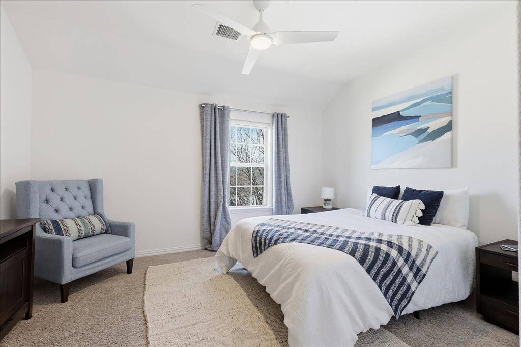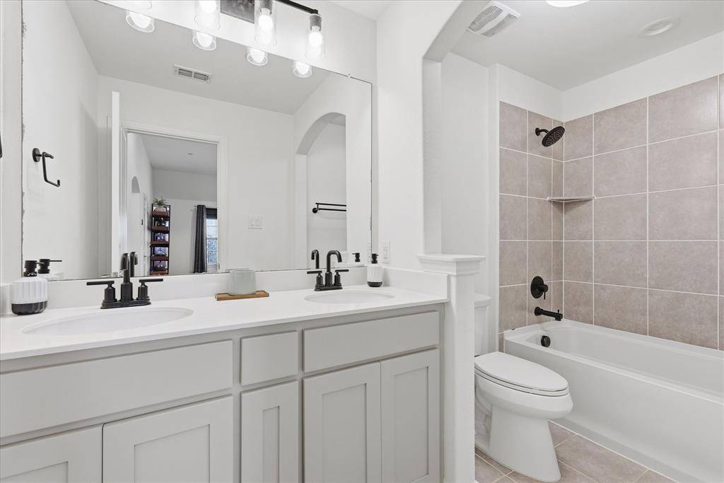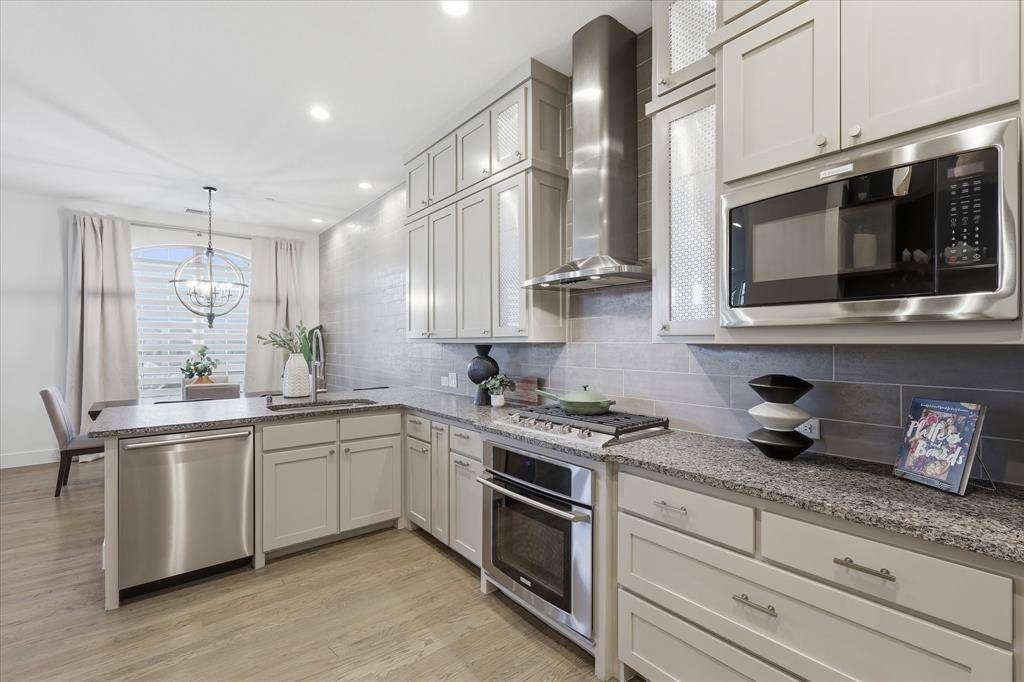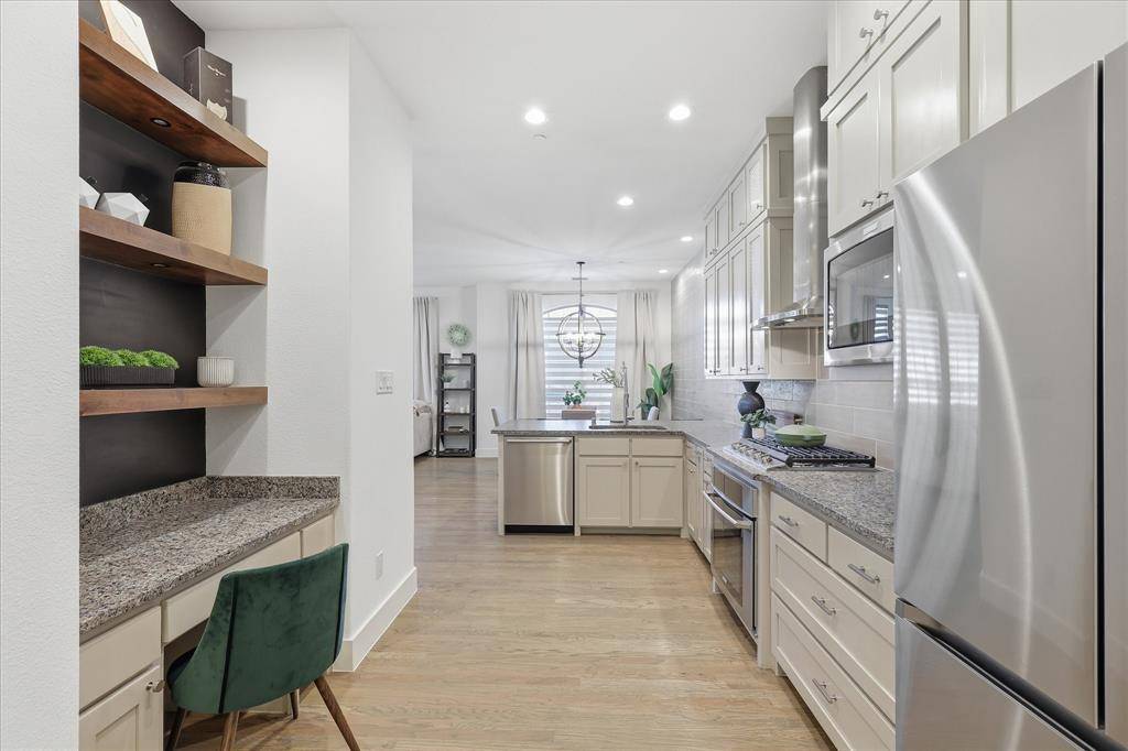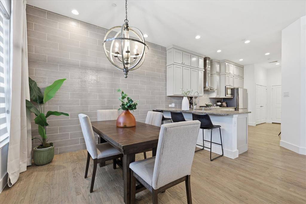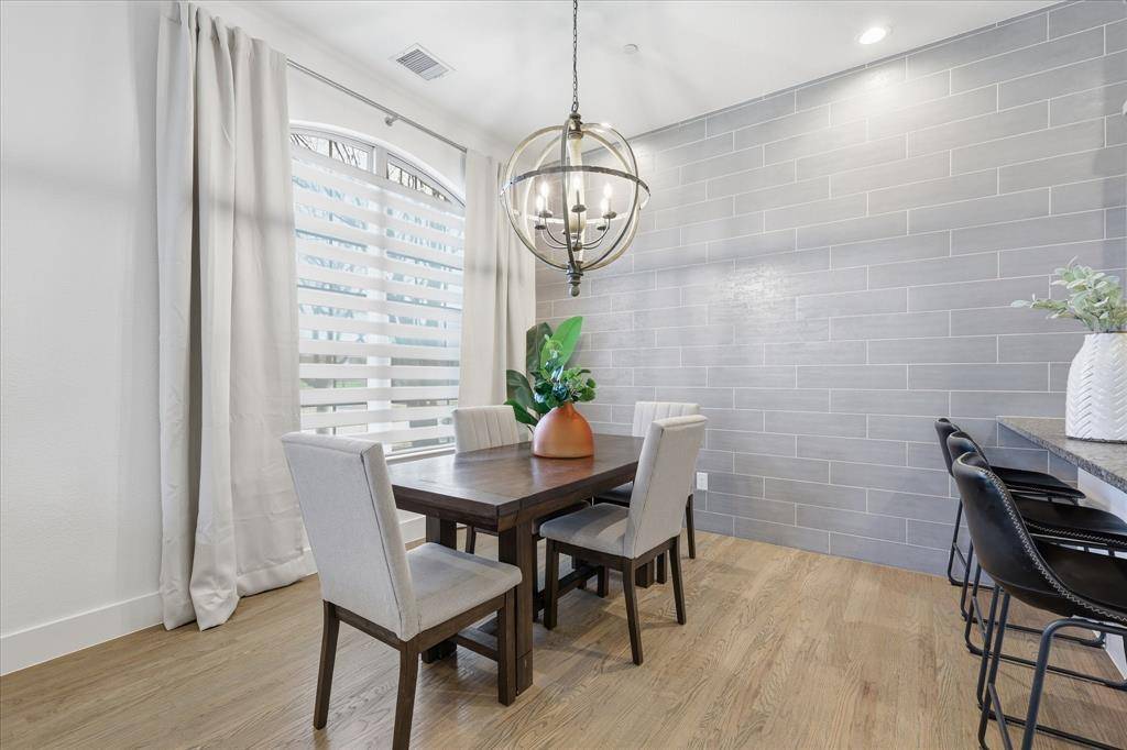 Stunning FORMER MODEL in sought after Mustang Park. Gorgeous luxury townhome with top of the line finishes & upgrades. Primary on the first floor! Hi-end gourmet kitchen with commercial SS appliances, soaring custom cabinetry, upgraded sink hardware and cabinet pulls, new dishwasher, cooktop plus eat-in island. Extensive REAL hardwoods first floor including primary. End Corner unit with volume ceilings & tons of windows which provide beautiful natural light. Two spacious bedrooms, flex gameroom, huge walkout attic storage plus office nook with built-in desk upstairs. Additional upgrades include: extensive landscape, epoxy garage floor, Schlage keypad entry, Ecobee thermostats, new toilets, shower fixtures, fans & light fixtures upstairs, Ring Security System: door bell, flood lights-camera on garage, sensors on all first floor windows, new can lights, new paint with modern baseboards first floor. This home is an immaculate show stopper! Move in ready! Community pool & trails. Great access to DNT,121, Bush, Legacy West, Grandscape, PCA & Hebron. See it today! This one will go fast!