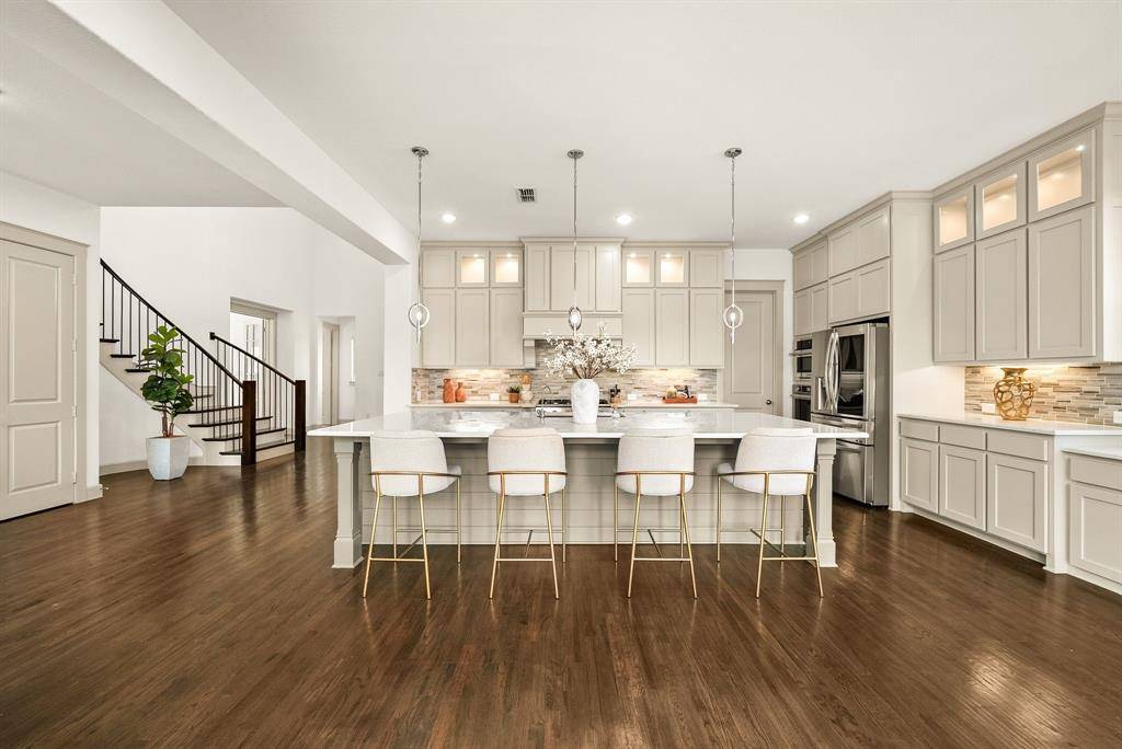 A grand two-story entry sets the tone, opening to expansive living spaces defined by soaring ceilings, refined architectural detailing, designer lighting, and abundant natural light. The chef's kitchen is a true statement, appointed with custom cabinetry, an oversized island, premium appliances, and seamless flow into the main living and dining areas, ideal for elegant entertaining or intimate gatherings.
