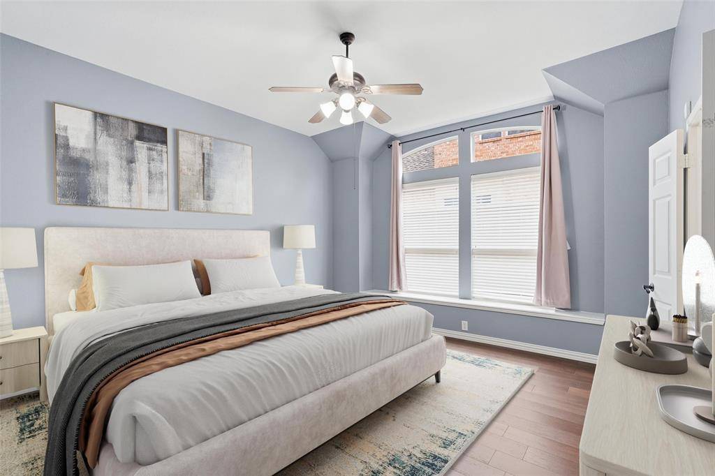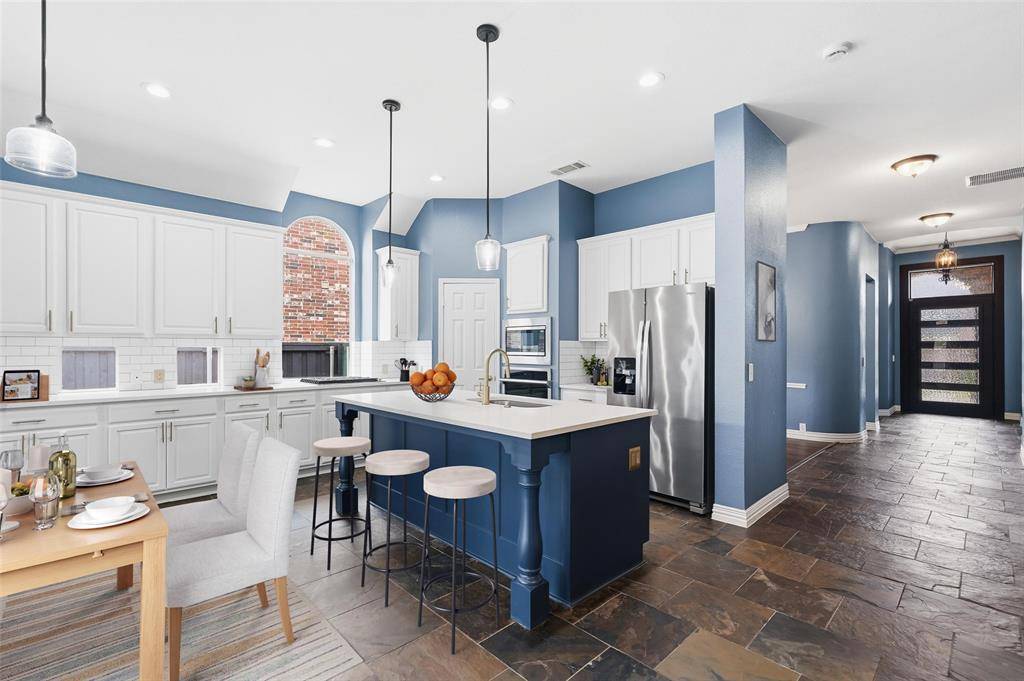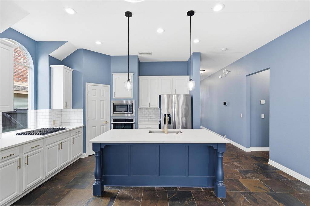 Welcome to this beautifully fully remodeled 4-bedroom, 3-bath single-story home featuring an open and inviting floor plan with modern finishes throughout. A grand iron front door with decorative glass creates a stunning first impression as you enter. Inside, you'll find a spacious, open layout with slate, wood, and carpet flooring, fresh interior paint, and updated lighting that give the home a bright, contemporary feel. The heart of the home is the gorgeous kitchen featuring quartz countertops, abundant cabinet and counter space, and a huge center island perfect for entertaining. The kitchen flows seamlessly into the living area, highlighted by a striking stone and marble gas fireplace and wood floors. The primary suite offers a luxurious retreat with a fully remodeled oversized bathroom featuring quartz countertops, huge tub, oversized shower and high-end finishes. The home also features a desirable split-bedroom layout with an en-suite bath for two bedrooms plus an additional guest bath and another bedroom.. This offers flexibility for guests or multigenerational living. Recent Energy Star windows installed that enhance comfort and efficiency. Step outside to enjoy true backyard living with a beautifully landscaped yard, complete with a covered, lighted arbor featuring a fan and TV, along with a charming oversized porch swing—perfect for relaxing evenings or entertaining guests. Located in the highly desirable Fairways neighborhood, this home feeds to highly rated Purefoy Elementary and is just minutes from The Trails Golf Course, the PGA District, and all that Frisco has to offer.