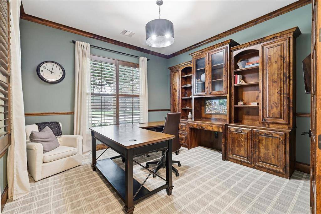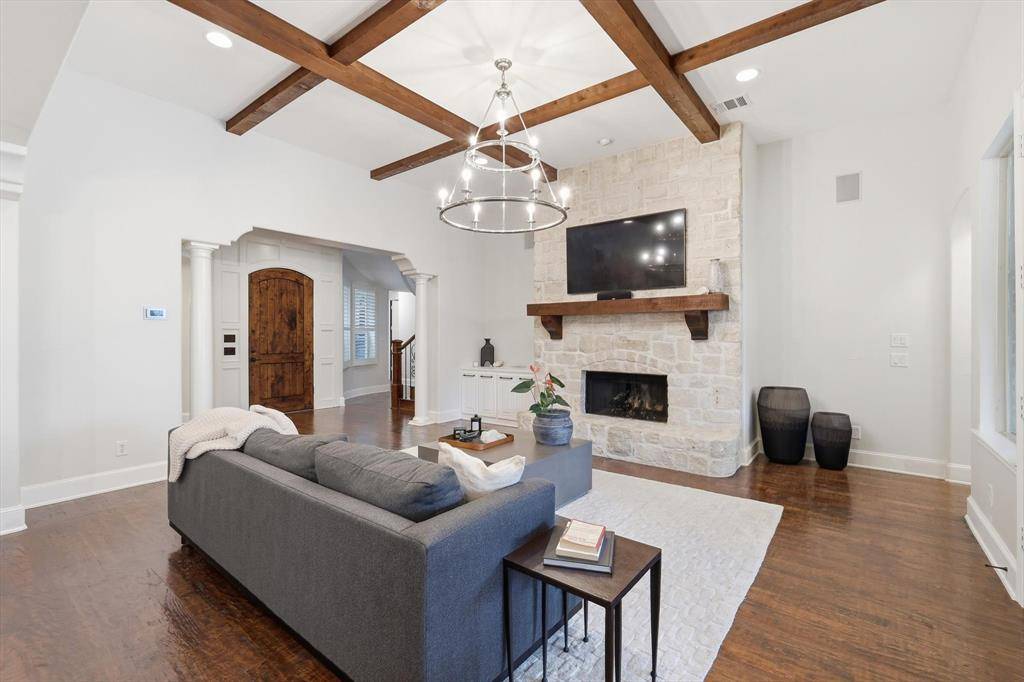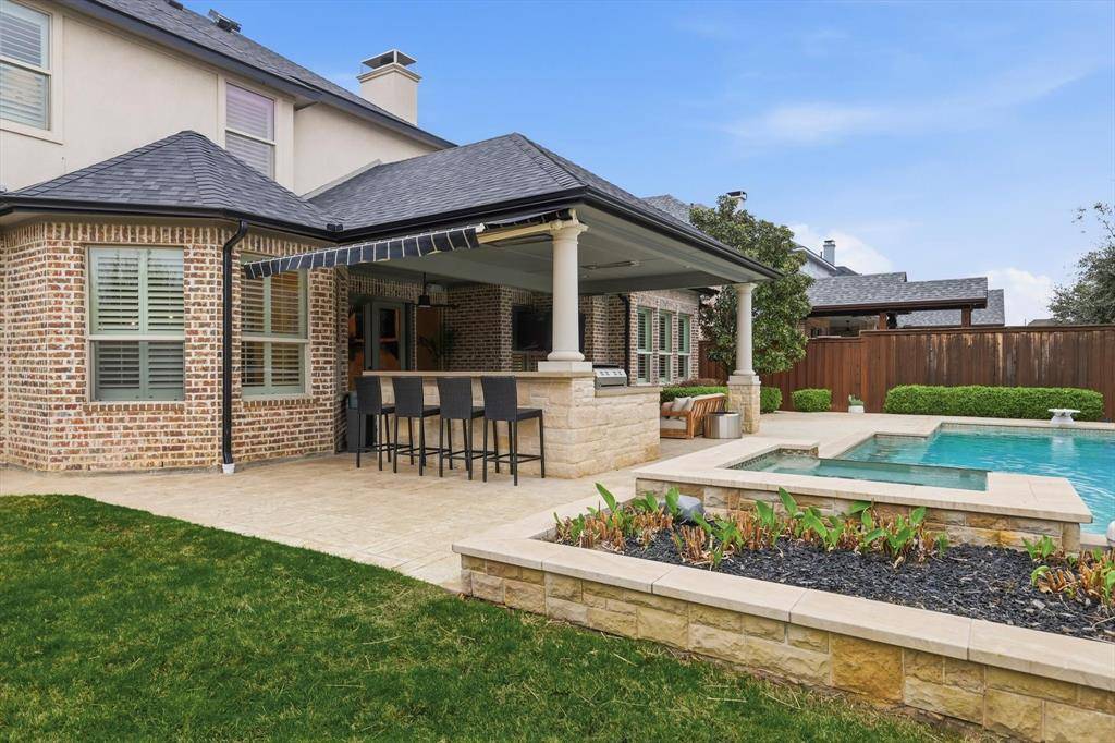 Welcome to this stunning 5-bedroom, 4.5-bathroom home with over 4,700 square feet of beautifully designed living space and exceptional curb appeal. An extra-large covered front entryway creates a grand first impression and invites you inside, where rich hardwood floors and an elegant rounded staircase set the tone for the home's sophisticated style. Just off the entry, a formal dining room with chandelier provides the perfect setting for hosting gatherings and special occasions. The heart of the home is the expansive open-concept kitchen, living, and breakfast area designed for everyday living and effortless entertaining. The living room features striking wood beam ceilings, a beautiful stone fireplace, and a wall of windows that showcase views of the backyard and fill the space with natural light. The chef's kitchen is both stylish and functional with a large accent gray island, light granite countertops, stainless steel appliances, double ovens, and a built-in refrigerator. The adjacent breakfast room offers abundant natural light and a welcoming place to start the day. The primary suite is privately located on the first floor and features a spacious ensuite bath with separate shower, deep soaking tub, and walk-in closet. Also on the main level is a secondary bedroom with a full bath, ideal for guests or multigenerational living, along with a private study. Upstairs you'll find three additional bedrooms, an office, media room, and a large game room, offering flexible spaces for work, play, and entertainment. Step outside onto the upstairs balcony to enjoy your morning coffee or unwind with evening sunset views. The backyard is a true retreat, featuring an extended covered patio with outdoor kitchen and seating area, a refreshing pool, and plenty of yard space to enjoy the outdoors. This exceptional home truly has it all—space, style, and incredible indoor-outdoor living. Don't miss your chance to make it yours.