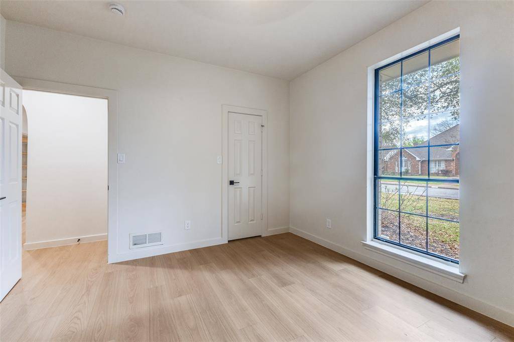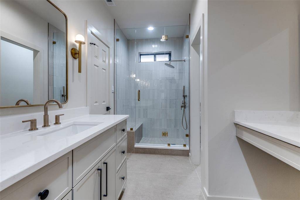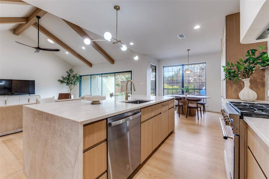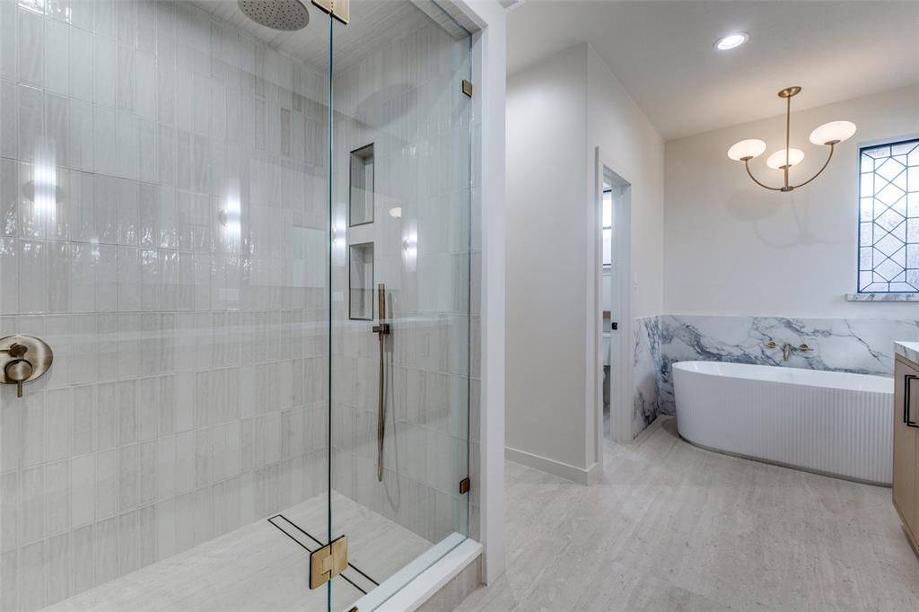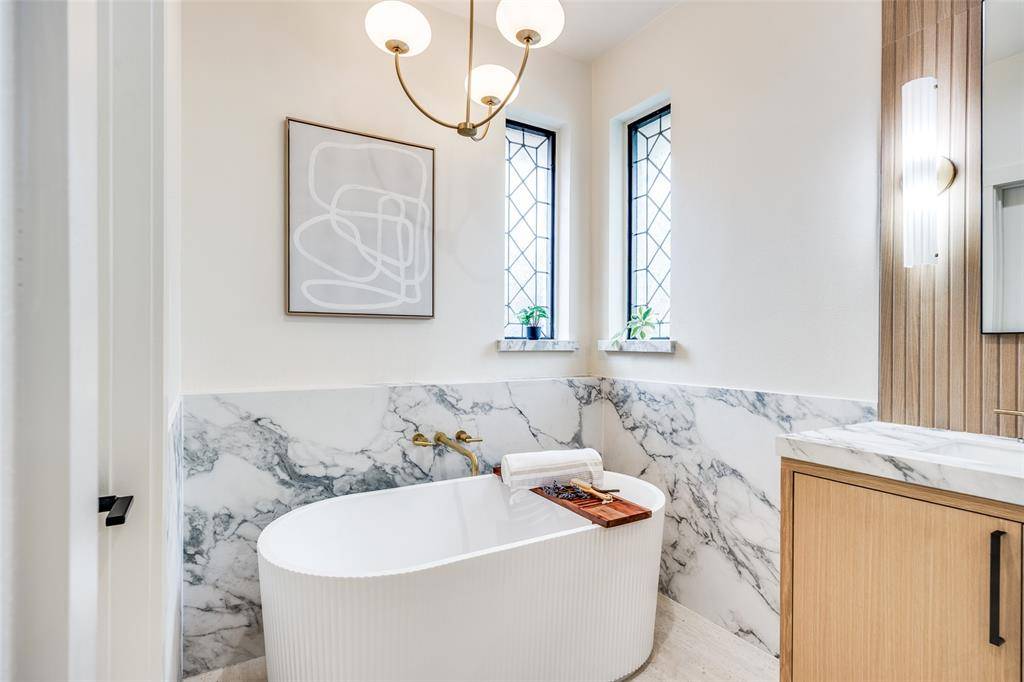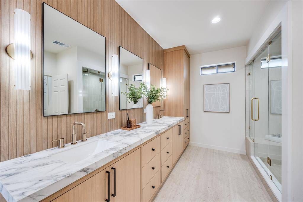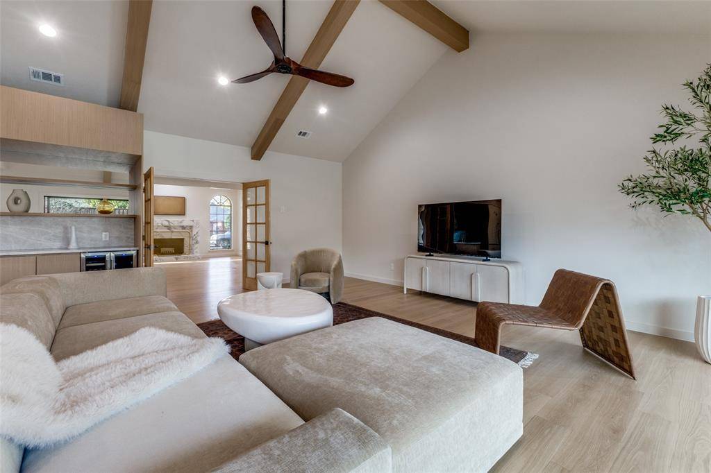 Central to the home is the open-concept kitchen, breakfast area, and living room overlooking the backyard and in-ground pool. The space is complemented by a wood-beamed cathedral ceiling, accent lighting, and French doors separating areas more quiet. The double waterfall kitchen island features luxurious Taj Mahal quartzite with a honed finish—tactile and delicious. White oak cabinetry and a one-of-a-kind curved range ventilation hood add to the high-end design aesthetic. You'll love the walk-in pantry with countertops, drawers, and shelving. The wet bar acts as an extension of the kitchen and includes a beverage chiller, sink, and shelving above. The sophisticated primary suite is designed for homeowners who value style and luxury. A spacious shower with gorgeous tile, brass hardware, and a glass enclosure is complemented by a freestanding soaking tub. The bath is accented with quartz counters, a fluted tile backsplash, and wall sconces, all presented in soft tones with modern touches and elegance. Baths two and three are appointed with similar finishes.